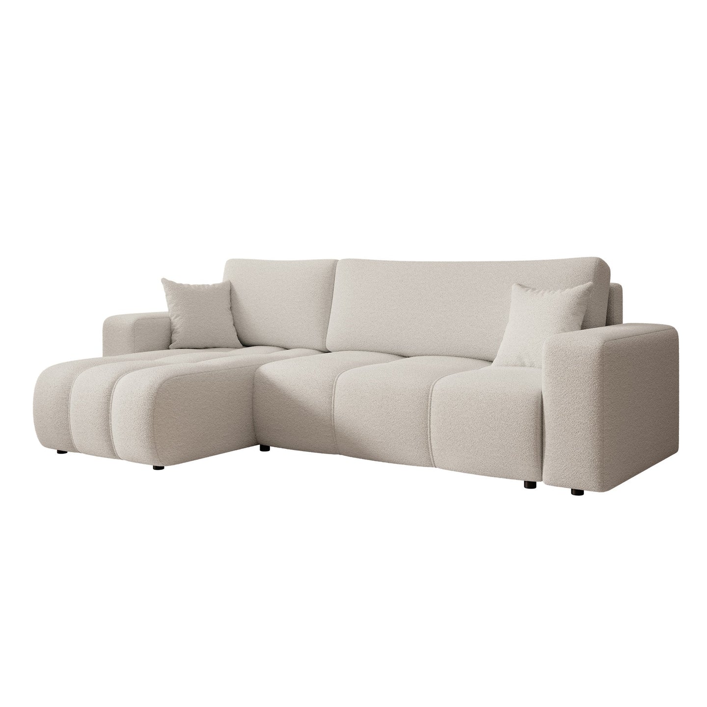 The Feather corner sofa is a symmetrical L-shaped corner sofa suitable for three people. This means you can place the lounge on either the left or right side. The sofa consists of a chaise longue and a two-seater. The Feather is upholstered in soft teddy fabric in white. Thick decorative seams run across the seat.