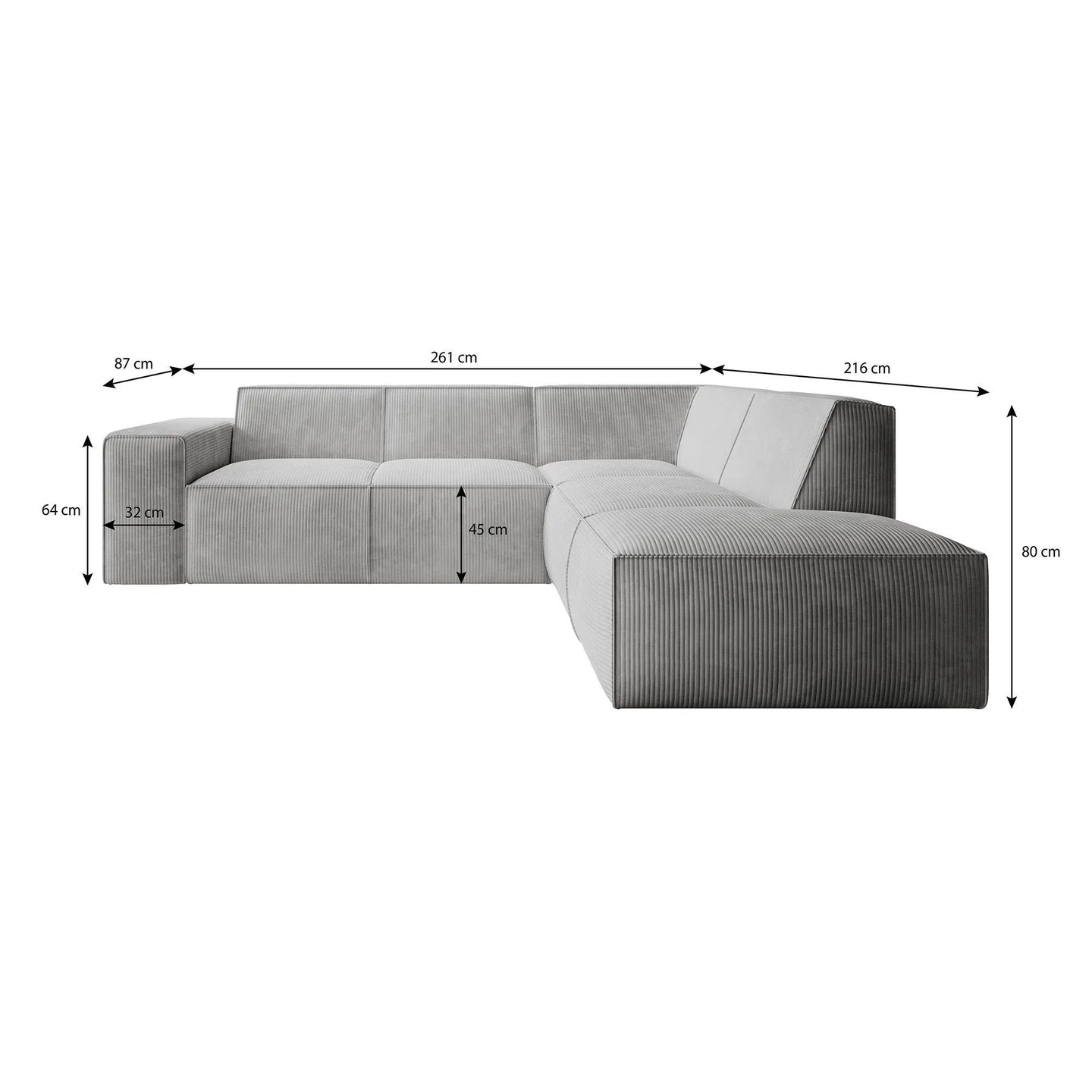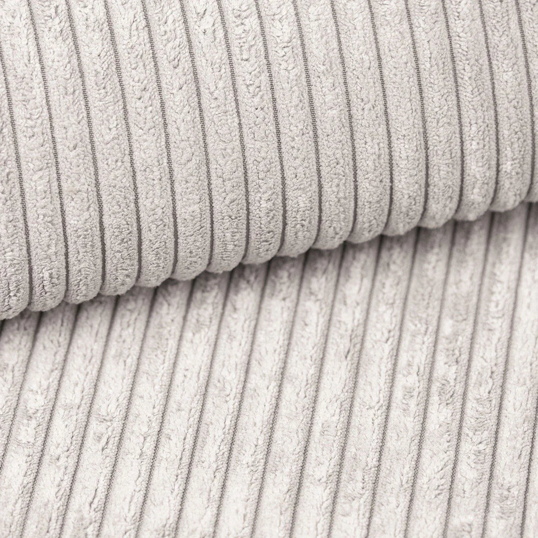 This spacious corner sofa in a modern L-shape can seat 4 to 5 people. The Monet is upholstered in soft ribbed fabric in a warm grey shade. The ribbed fabric feels soft to the touch.