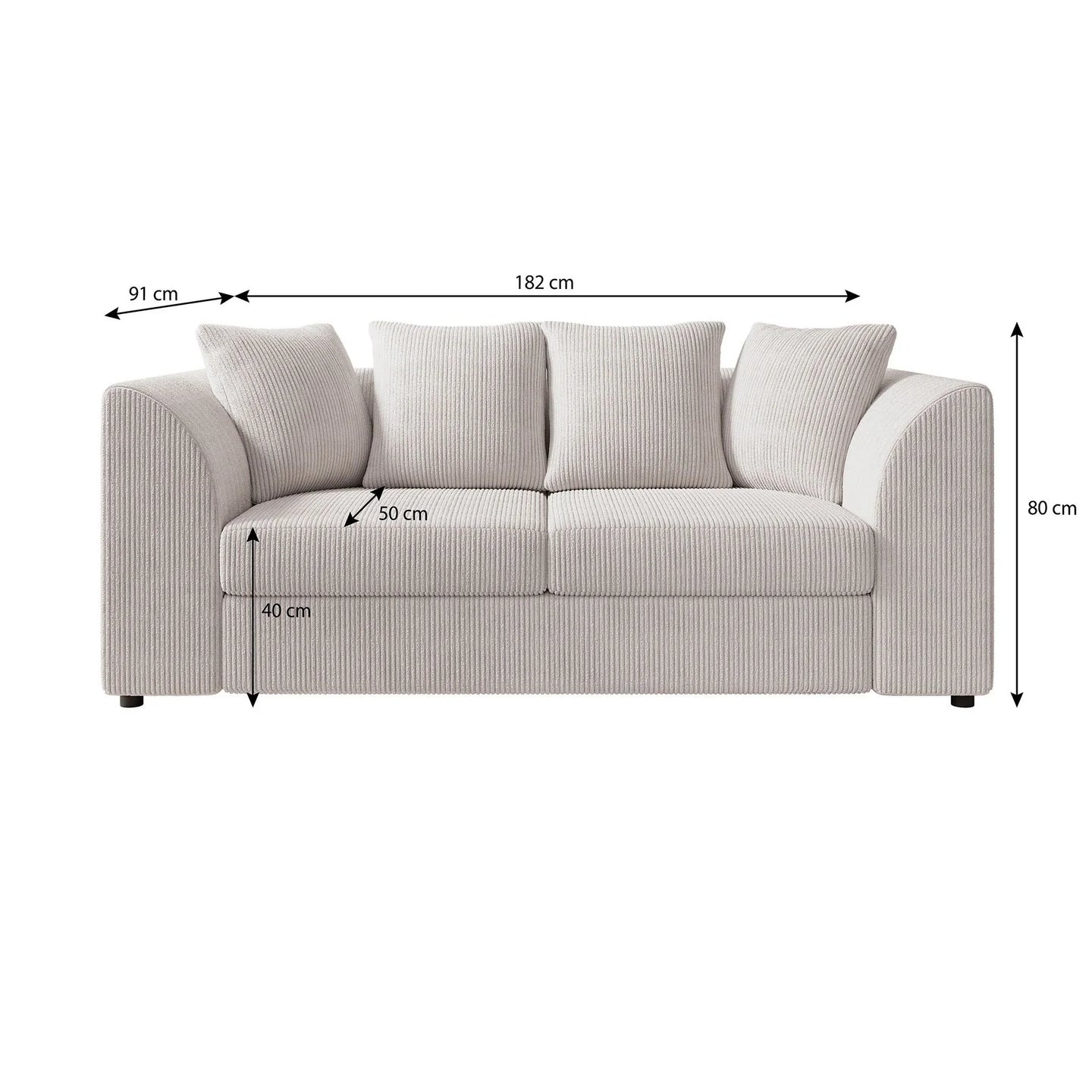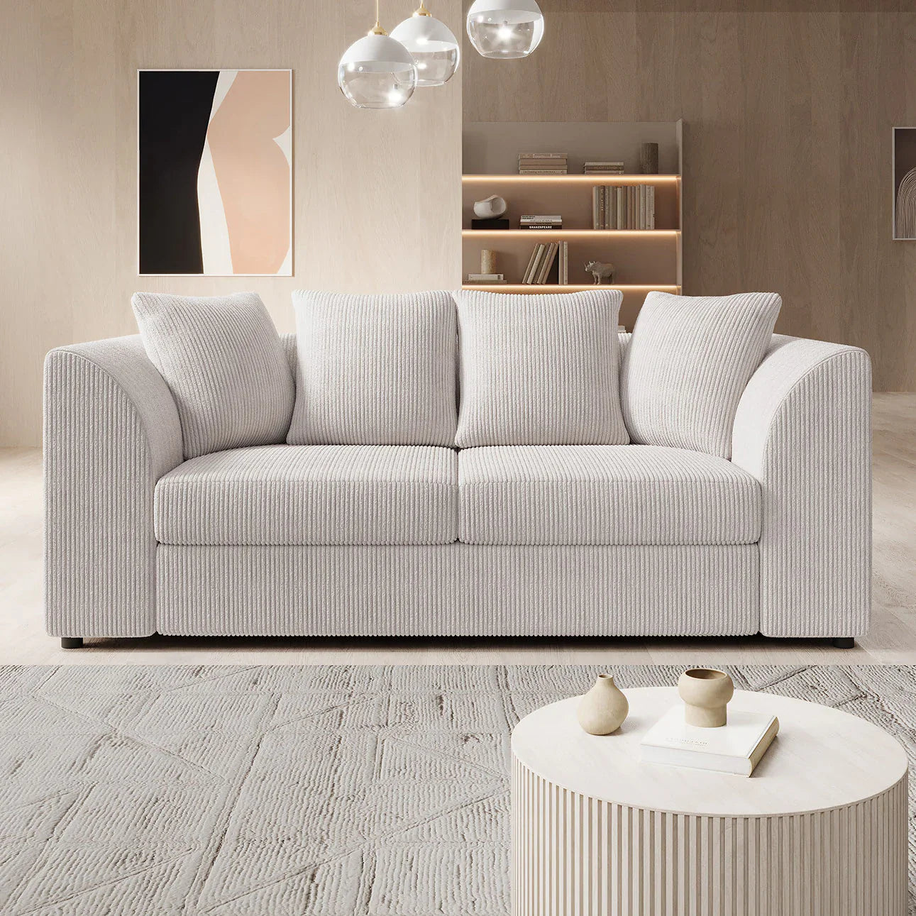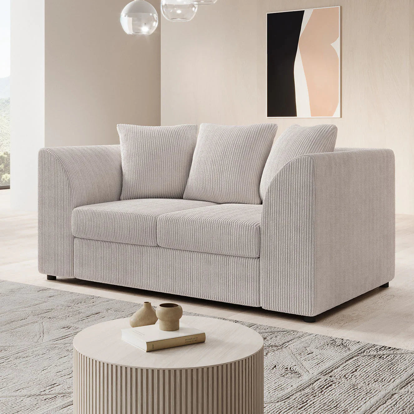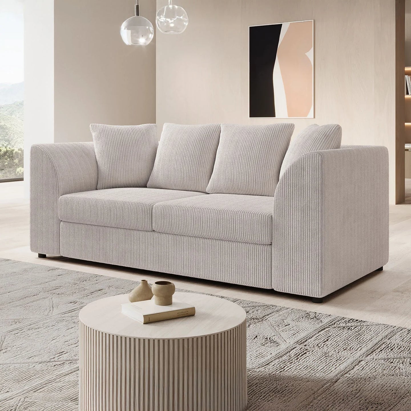 The Alfort 3-seater sofa in soft beige ribbed fabric is the perfect combination of comfort and compactness. With its rounded armrests and generous cushions, this sofa brings a warm and inviting feel to any interior.