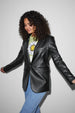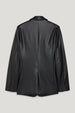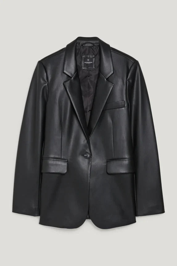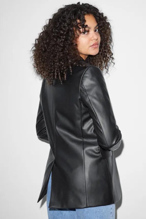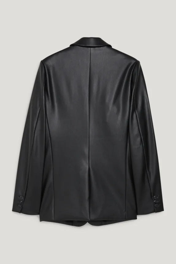 Smooth faux leather blazer with lightweight shoulder patches, a faux chest pocket, and two flap pockets. Back vent and woven lining.