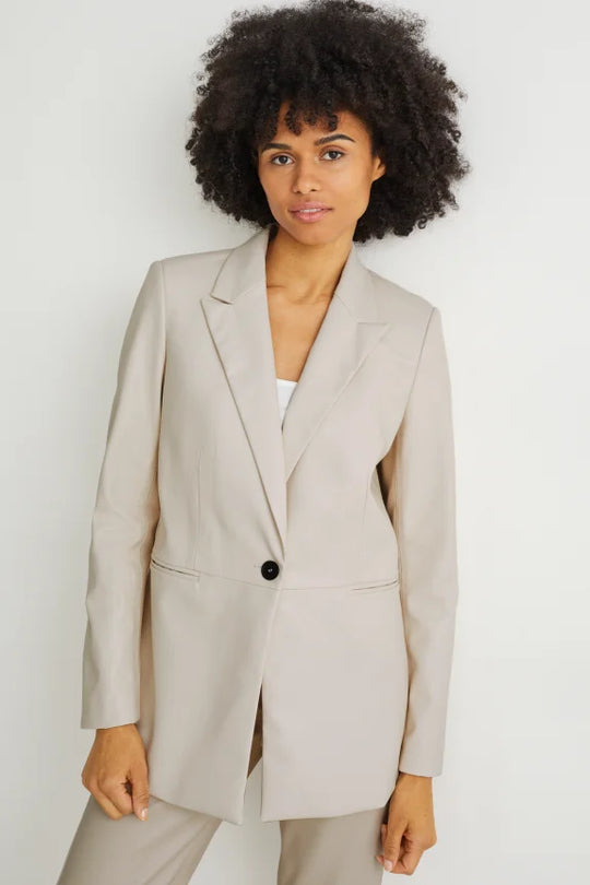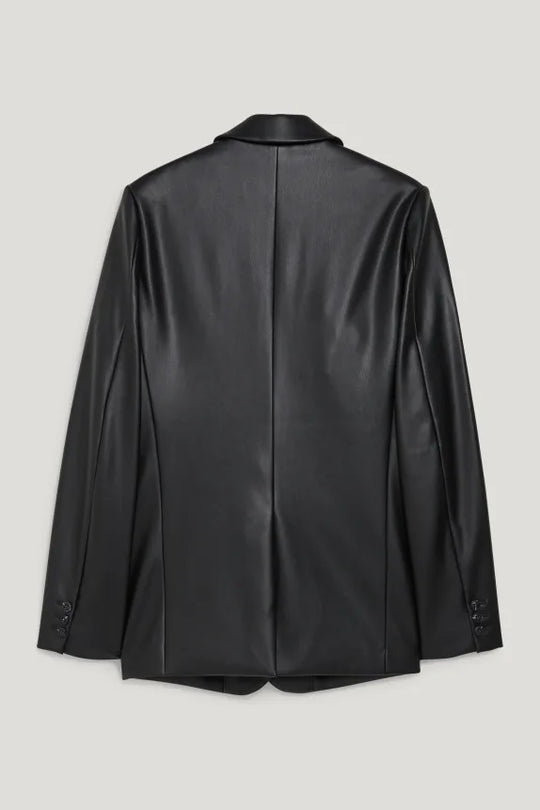 Smooth faux leather blazer with shoulder pads. Two side pockets, a back vent, and a smooth fabric lining. Collar: Lapel Sleeve length: Long sleeves Closure: Button closure Design: Plain Collection: Casual ÂReguliere prijs €110,00Reguliere prijs €110,00 -