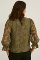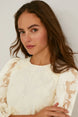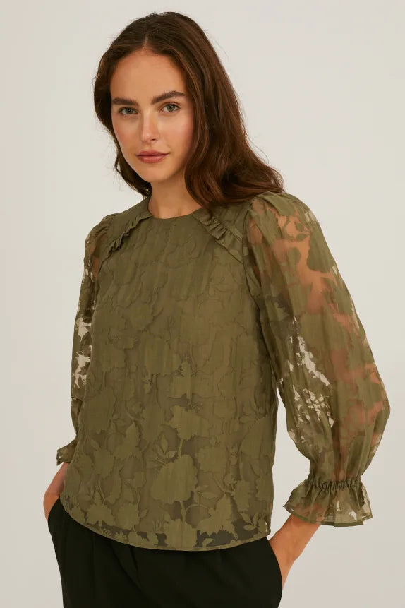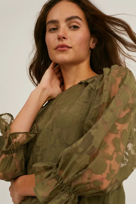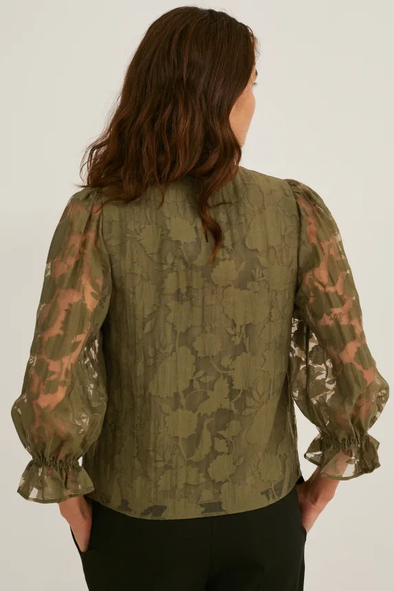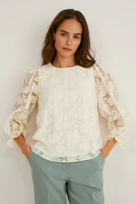 Blouse van semitransparante geweven stof, met vastgemaakte en ondoorzichtige ondertop. Versierd met ruches, elastische mouwboordjes en uitsnede in sleutelgatvorm achter, met knoop.