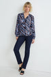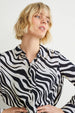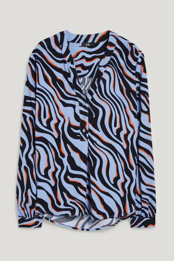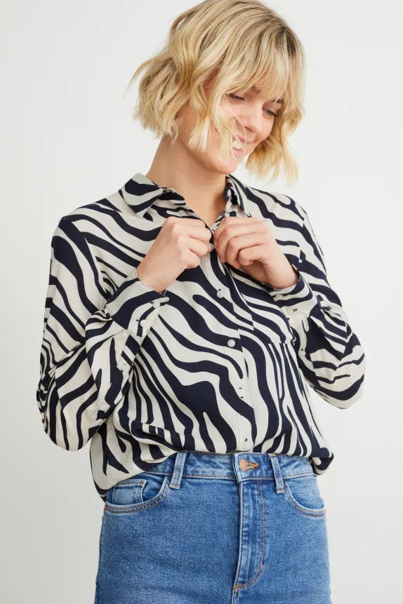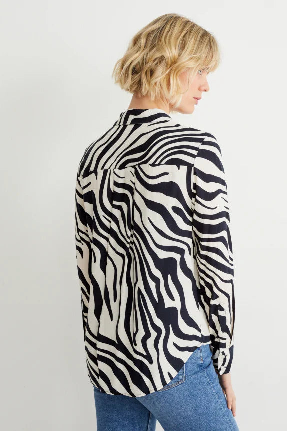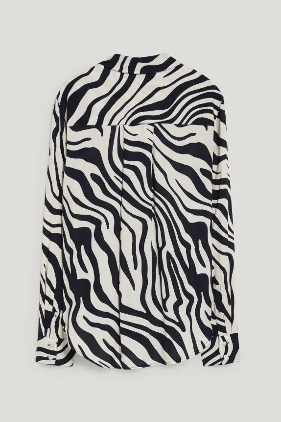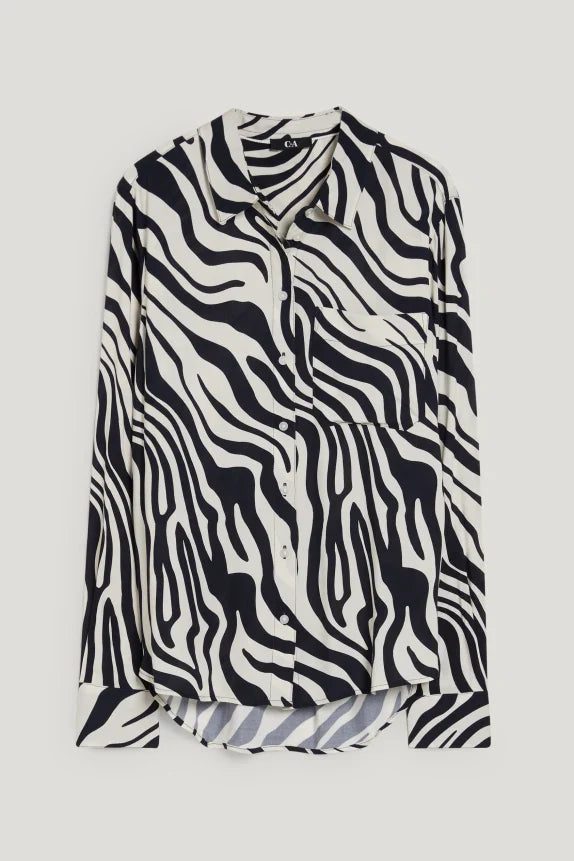 Blouse van een zachte, soepelvallende, geweven stof met zebrapatroon en opgestikte borstzak. 2-knoopsmanchetten en een afgeronde high-low-zoom.