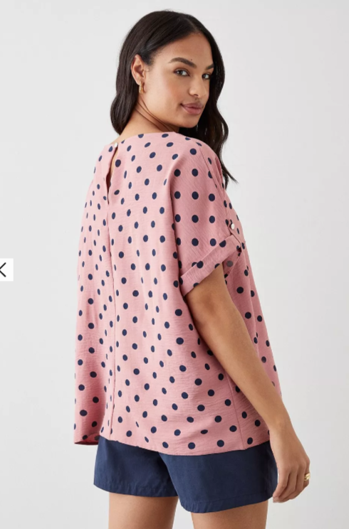 Cami or blouse? Shirt or bodysuit? Whatever you're after, our women's tops have you covered for every event in the social calendar. From casual fits to elevated styles for special occasions, we make it easy to nail the 'jeans and a nice top' look. Think puff sleeves, pretty prints, wrap silhouettes and so much more. Style: Pink Spot Roll Sleeve Blouse. Ideal for: Daywear. Fit: Relaxed. Made in the UK. Model wears size UK 10 and is 5' 9" tall. Make-up & Fragrance: Primer (Estée Lauder, The Mattifier Shine Control Perfecting Primer + Finisher), Foundation (Lancôme, Teint Miracle Luminous Satin Foundation), Mascara (Estée Lauder, Double Wear Zero-Smudge Lengthening Mascara), Blusher (Benefit, Wanderful World Blushes Starlaa Rosy Bronze Powder Blusher), Setting Spray (Benefit, Porefessional Super Setter Setting Spray Mini 30ml), Fragrance (Elie Saab, Elixir).