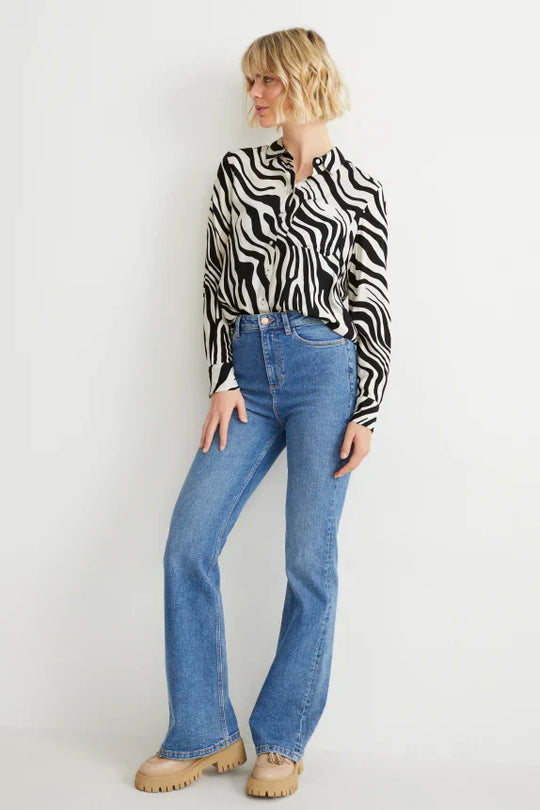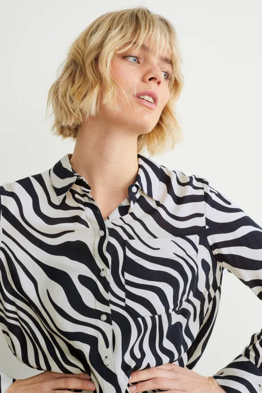 Clemens & August brand ladies blouse shirt zebra black white xs s m l xl xxl Blouse van een zachte, soepelvallende, geweven stof met zebrapatroon en opgestikte borstzak. 2-knoopsmanchetten en een afgeronde high-low-zoom. Vorm van de...Reguliere prijs €45,00Reguliere prijs €45,00 -