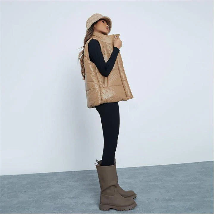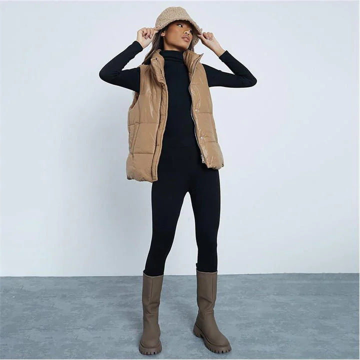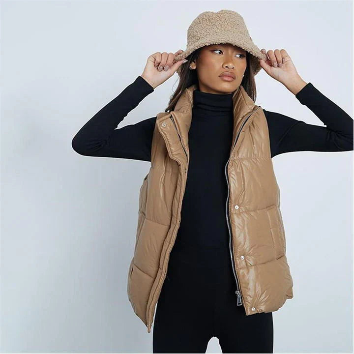 Gilet in a quilted padded style and oversized fit with front pockets, funnel neck and zip front fastening.