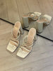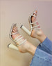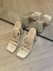 The heels have a leather look and a sturdy 11 cm block heel. The straps around the instep are elastic, making them comfortable to walk in.