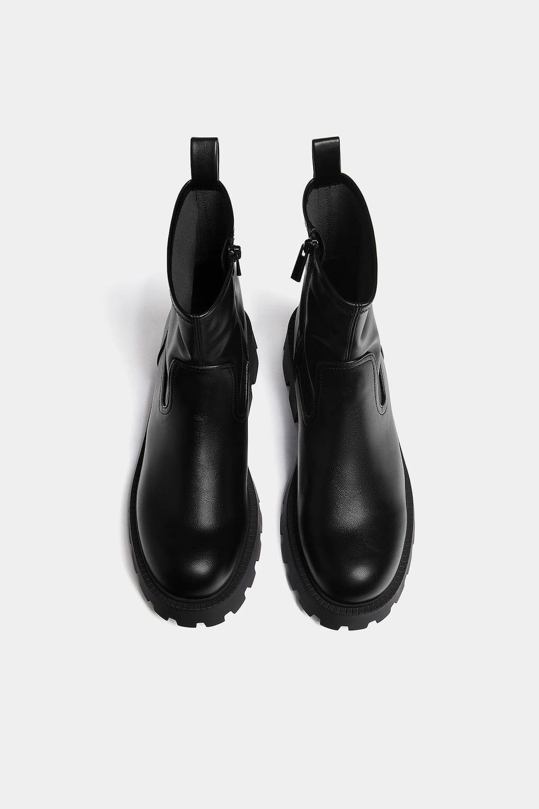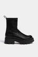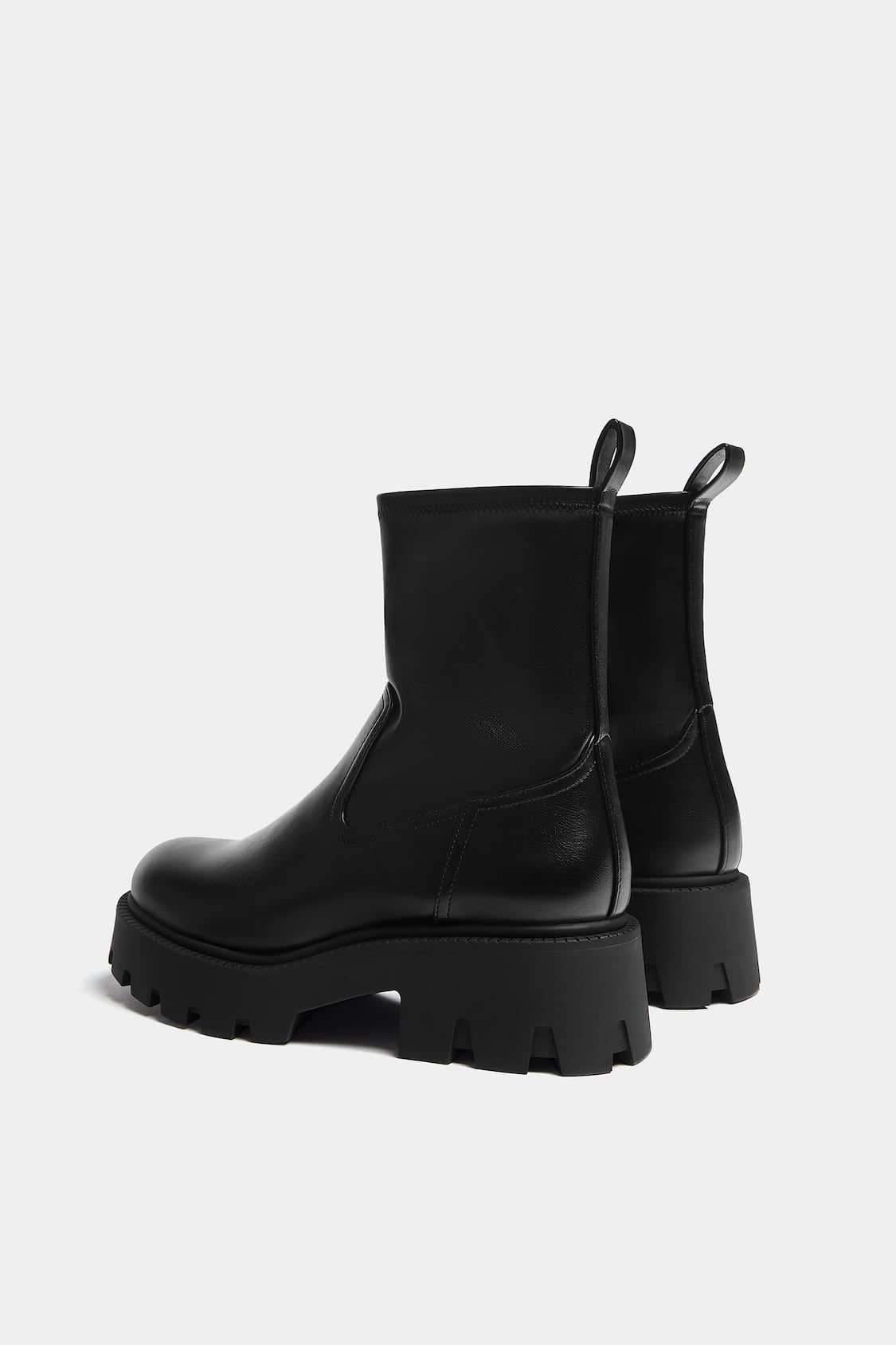 Flat ankle boot with stretch shaft, pull tab at the back, thick track sole, and round toe. Available in various colors.