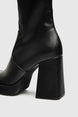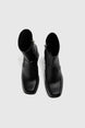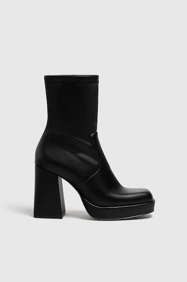 Black ankle boots with an elasticated upper, an internal zipper, a square toe, and a high block heel.