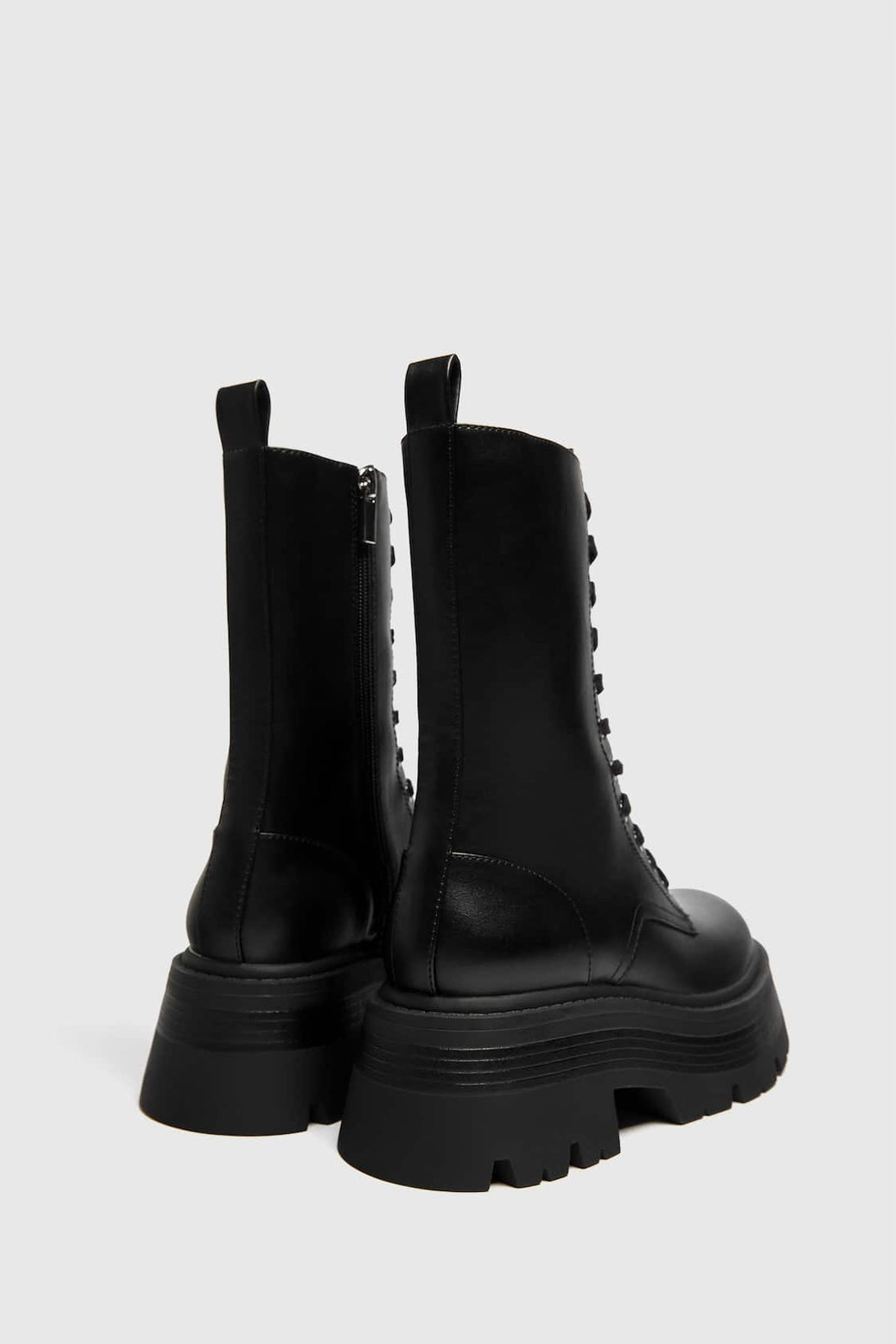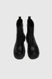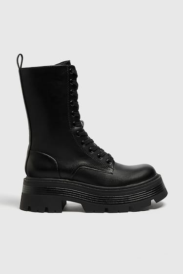 Black lace-up ankle boot with a thick track sole and an internal zipper. Flexible technical polyurethane composite foam insole, designed for enhanced comfort.