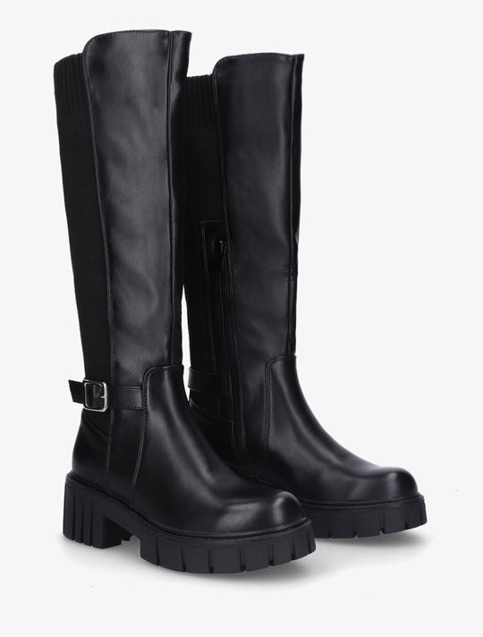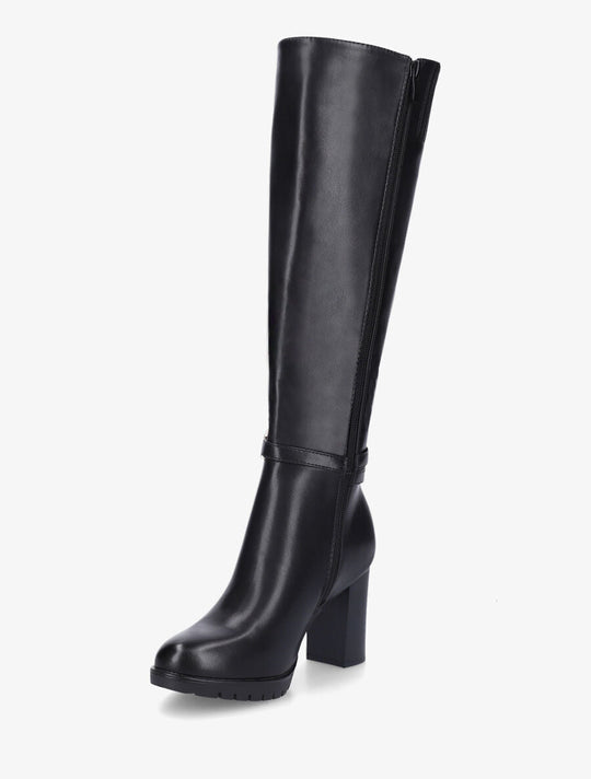 Product details Faux leather bootsShaft height: 44 cmHeel height: 7 cmNon-elastic calf: 32 cmSerrated soleBlock heelDecorative strap with buckleZipper on the inside of the legRound toeReguliere prijs €100,00Reguliere prijs €100,00 -