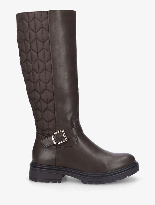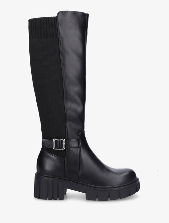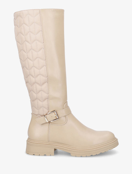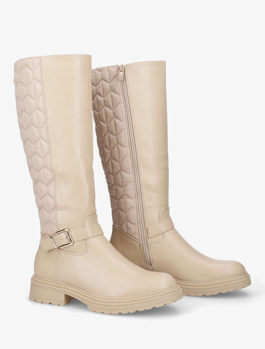 Product details Imitation leather and fabric bootsStyle: 35 cmHeel: 4 cmNon-elastic calf circumference: 33 cmBlock heel and notched solePadded calf fabricZipper closure on the inside of the legsAnkle decorated with a buckleRound toesReguliere prijs €100,00Reguliere prijs €100,00 -