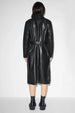Mantel van imitatieleer, met ceintuur van dezelfde stof, twee insteekzakken en deels gevoerd met geweven stof.
