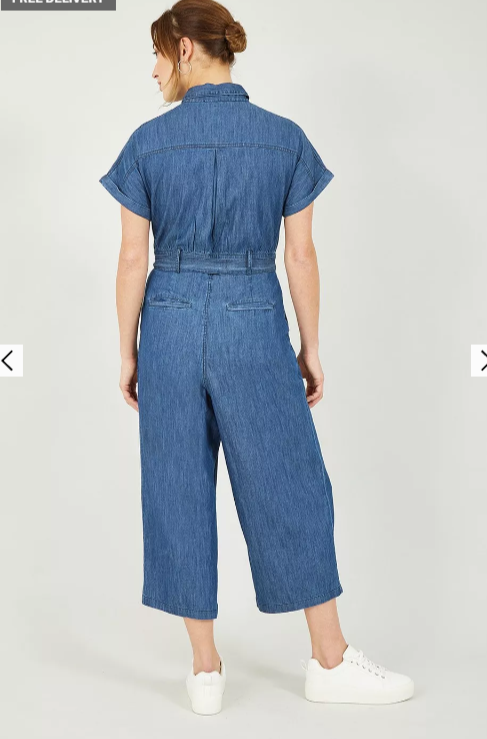 This denim-look chambray utility boiler suit is crafted from 100% cotton and features a bordered zip up fastening with pull ring detail, wide cullotte legs, a flattering waist tie belt and a classic boiler suit cut, with short sleeves and a collar.