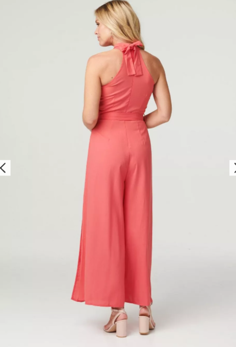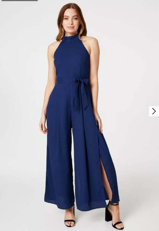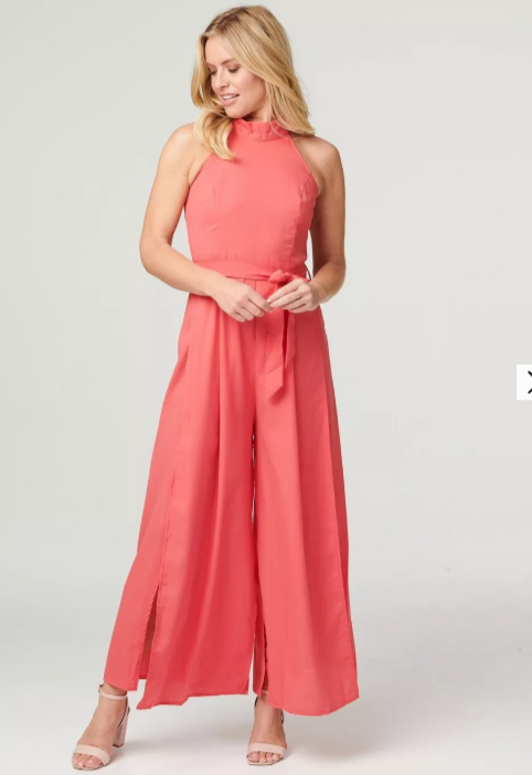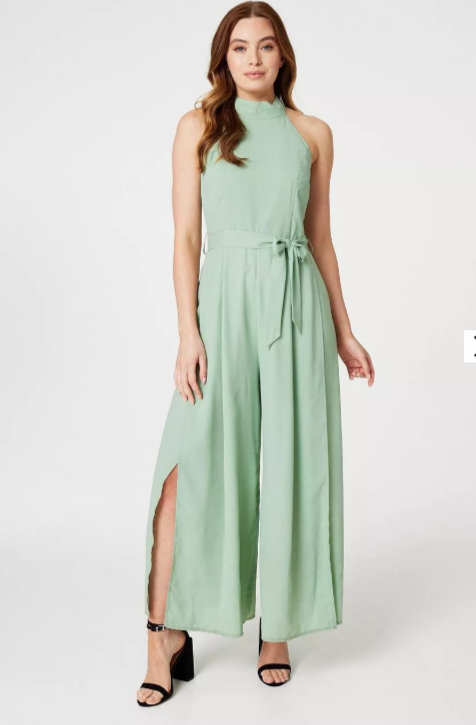 Need something standout for a special occasion? Try an elegant jumpsuit like this one. It has a high neck with a self-tie detail, a zip back, fitted bodice, detachable self-tie belt and a wide leg silhouette with front splits. Pair with neutral or metallic heels for a statement style that'll have the wow factor at any event