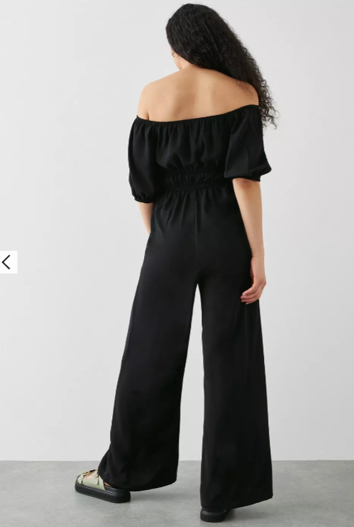 Want maximum impact with minimal effort? Cue our new season collection of jumpsuits. This season, we're all for retro silhouettes, denim fits, feminine tailoring and so much more. If you're looking for an everyday wardrobe hero, our jumpsuits & playsuits are the all-in-one answer for looking and feeling your very best. Style: Black Bardot Jumpsuit. Ideal for: Daywear. Fit: Regular. Design: Shirred. Made in the UK. Model wears size UK 10 and is 5' 9" tall. Make-up & Fragrance: Primer (Estée Lauder, The Mattifier Shine Control Perfecting Primer + Finisher), Foundation (Lancôme, Teint Miracle Luminous Satin Foundation), Mascara (Estée Lauder, Double Wear Zero-Smudge Lengthening Mascara), Blusher (Benefit, Wanderful World Blushes Starlaa Rosy Bronze Powder Blusher), Setting Spray (Benefit, Porefessional Super Setter Setting Spray Mini 30ml), Fragrance (Elie Saab, Elixir).