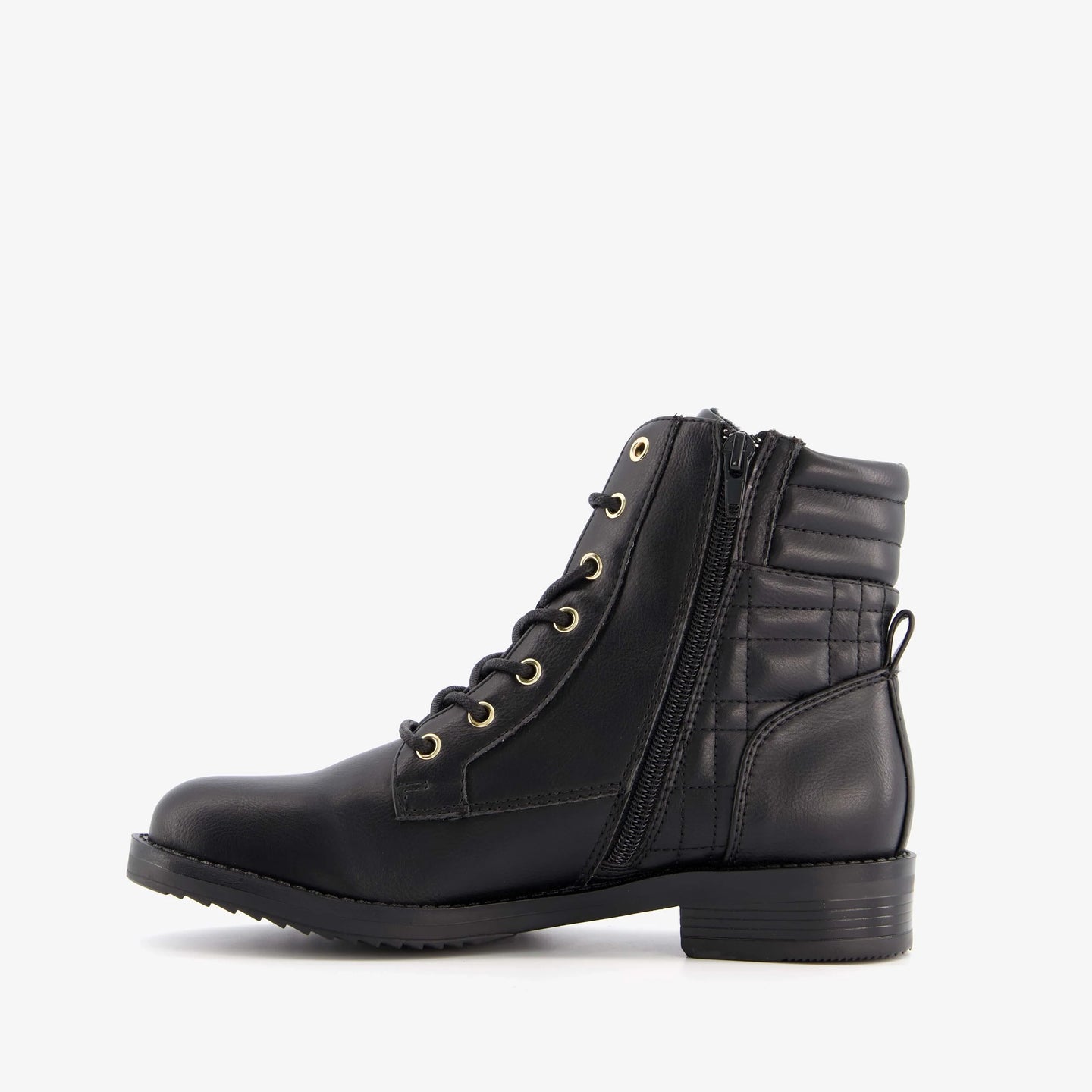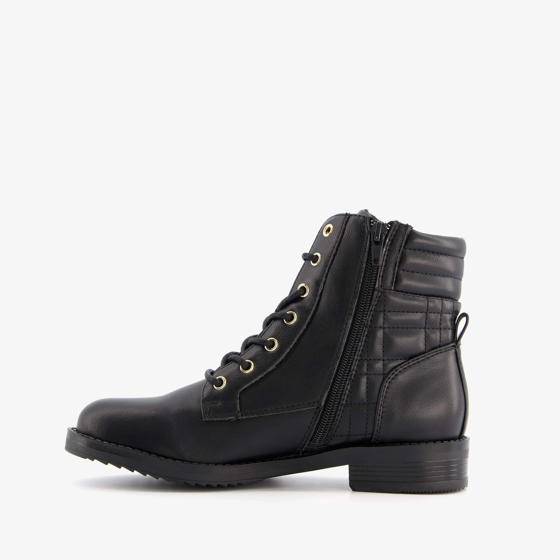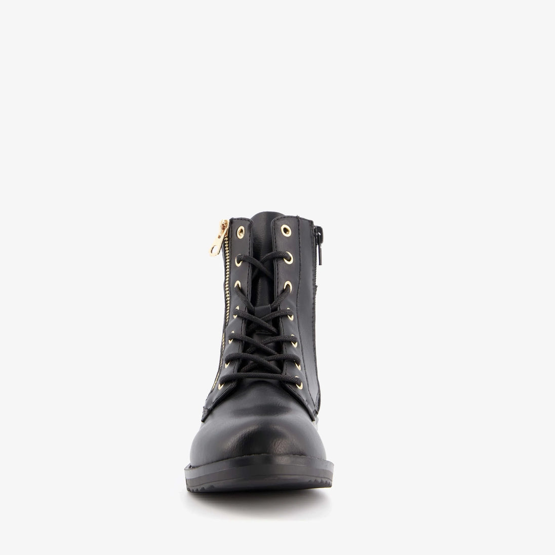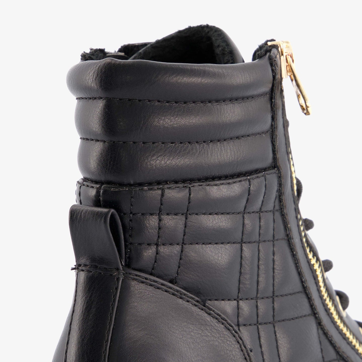 Made of imitation leather, with a faux leather lining and a sturdy treaded sole. The boots have laces and an inner zipper. The comfortable, non-removable textile footbed is also available. The lace-up boots feature a stitched pattern on the side panels and a decorative gold-colored zipper on the outer side. They have a low heel of approximately 1.5 cm and a shaft height of 13 cm.