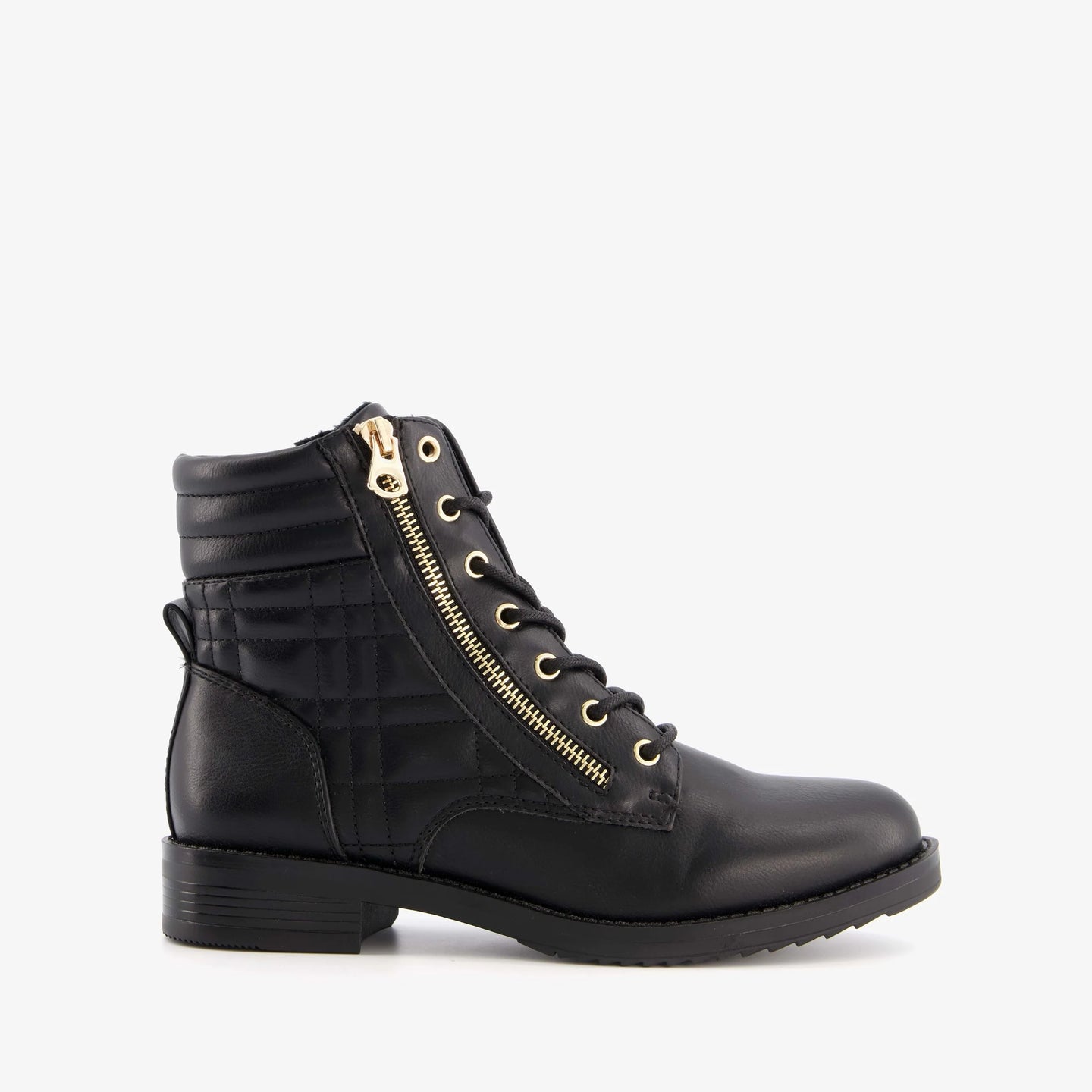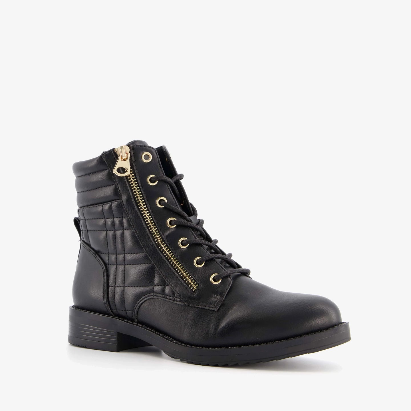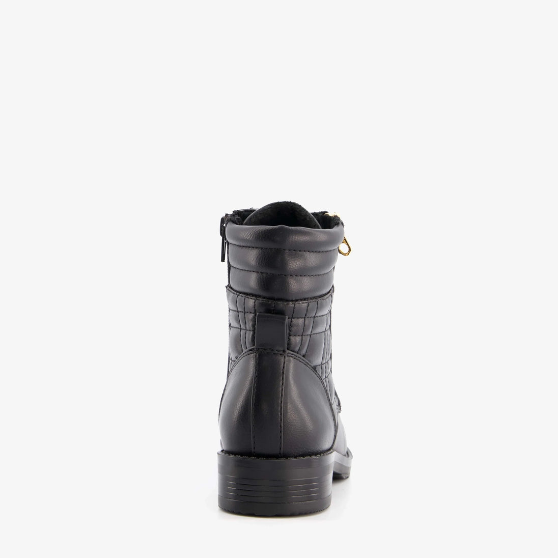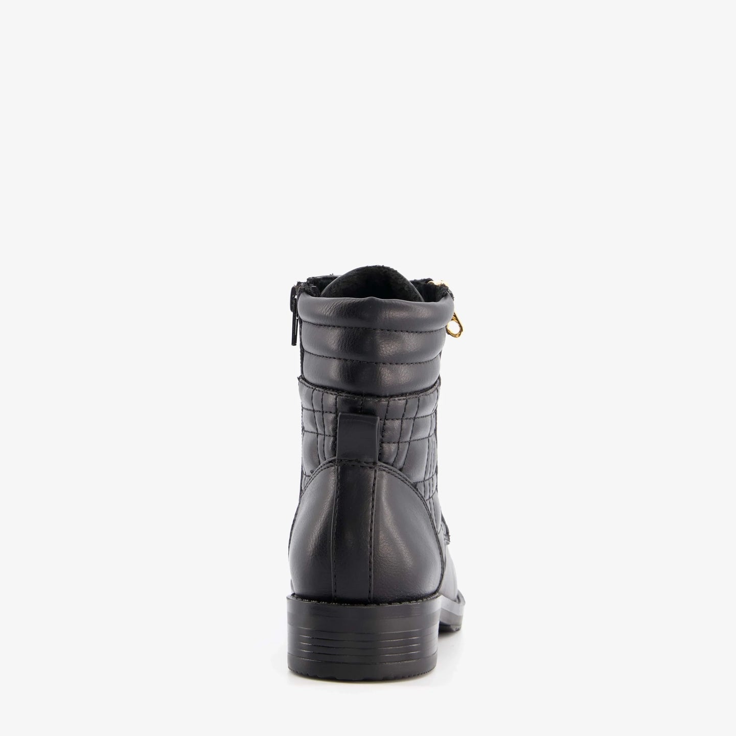 Made of imitation leather, with a faux leather lining and a sturdy treaded sole. The boots have laces and an inner zipper. The comfortable, non-removable textile footbed is also available. The lace-up boots feature a stitched pattern on the side panels and a decorative gold-colored zipper on the outer side. They have a low heel of approximately 1.5 cm and a shaft height of 13 cm.