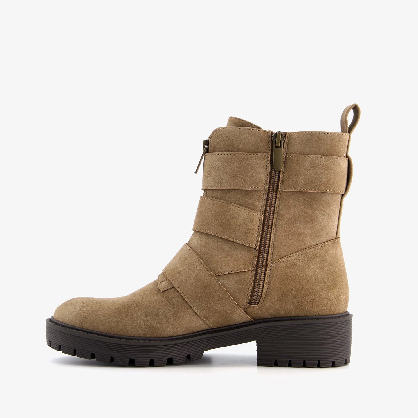 Made of faux suede, with a faux leather lining and a rubber sole. The biker boots have an inner zipper and three buckles. A heel tab makes them easy to put on. The comfortable, non-removable faux leather footbed is made of faux leather. The biker boots have a shaft height of 15 cm and a low heel of approximately 2 cm.