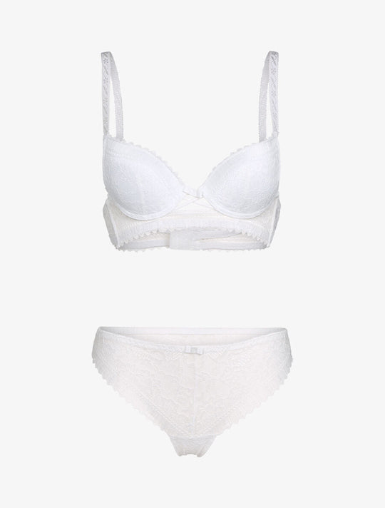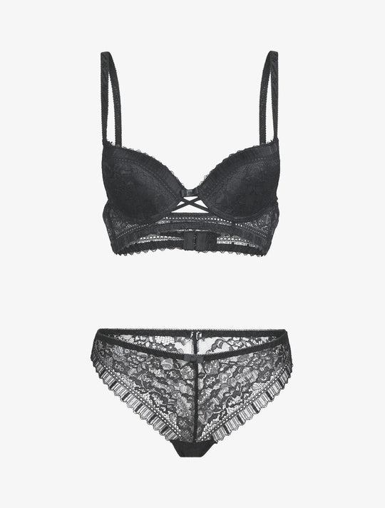 85B/36 S 85C/36 S 90B/38 M 90C/38 M 95B/40 L 95C/40 L 100C/42 XL Push-up bra with floral lace Adjustable straps Crossed straps at the back Hook closure Matching thong with cutouts StretchReguliere prijs €30,00Reguliere prijs €30,00 -