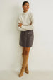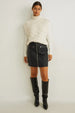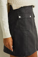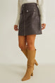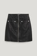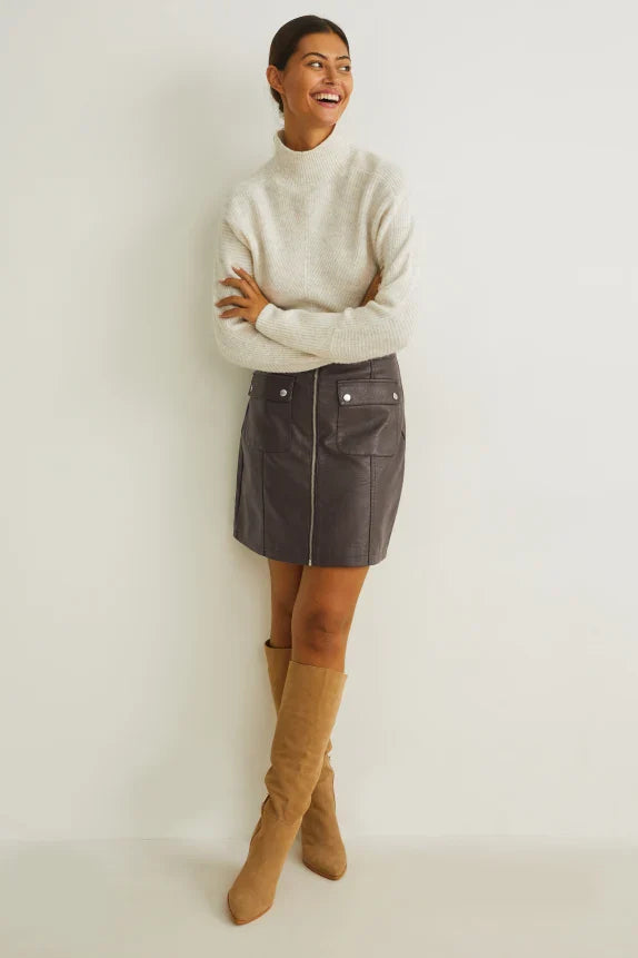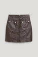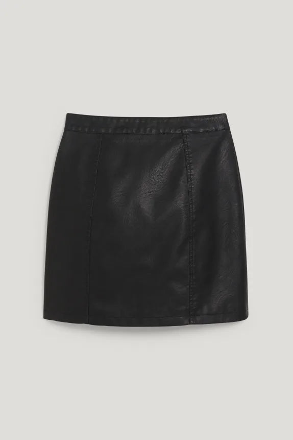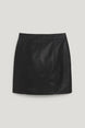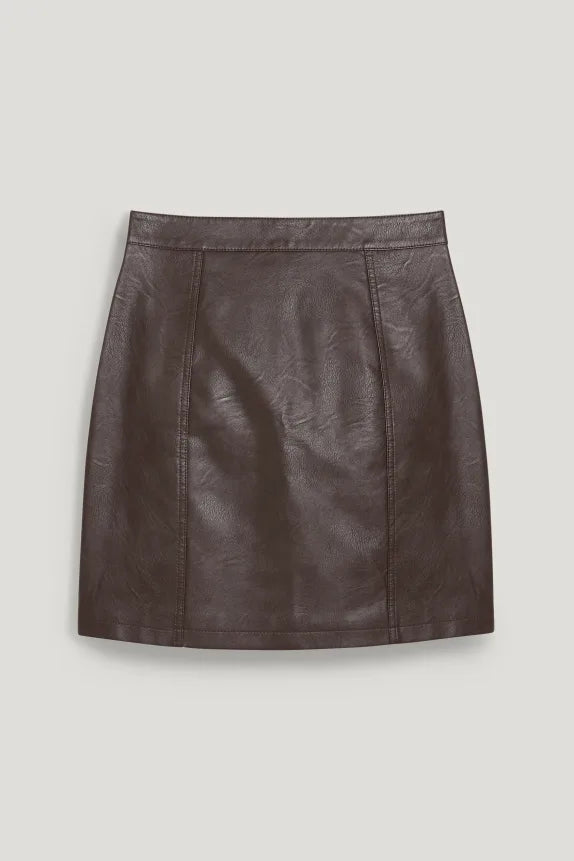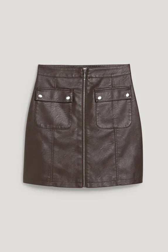 Rok van zacht imitatieleer met tonale siernaden. Rits in het midden, twee opgestikte zakken met klep en drukknoop. Gladde voering van stof.