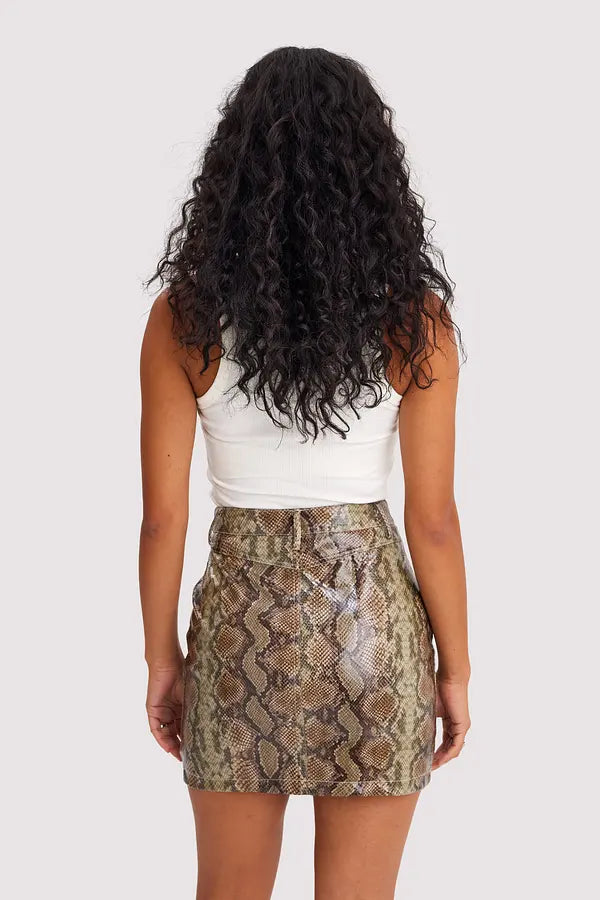Deze rok heeft een rits en een gestoffeerde knoop aan de voorzijde, steekzakken aan de zijkanten, riemlussen en een PU leren stof met een slangenprint.
