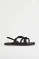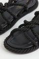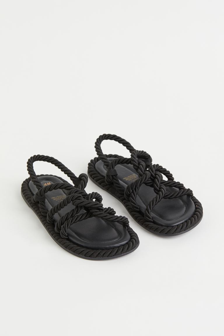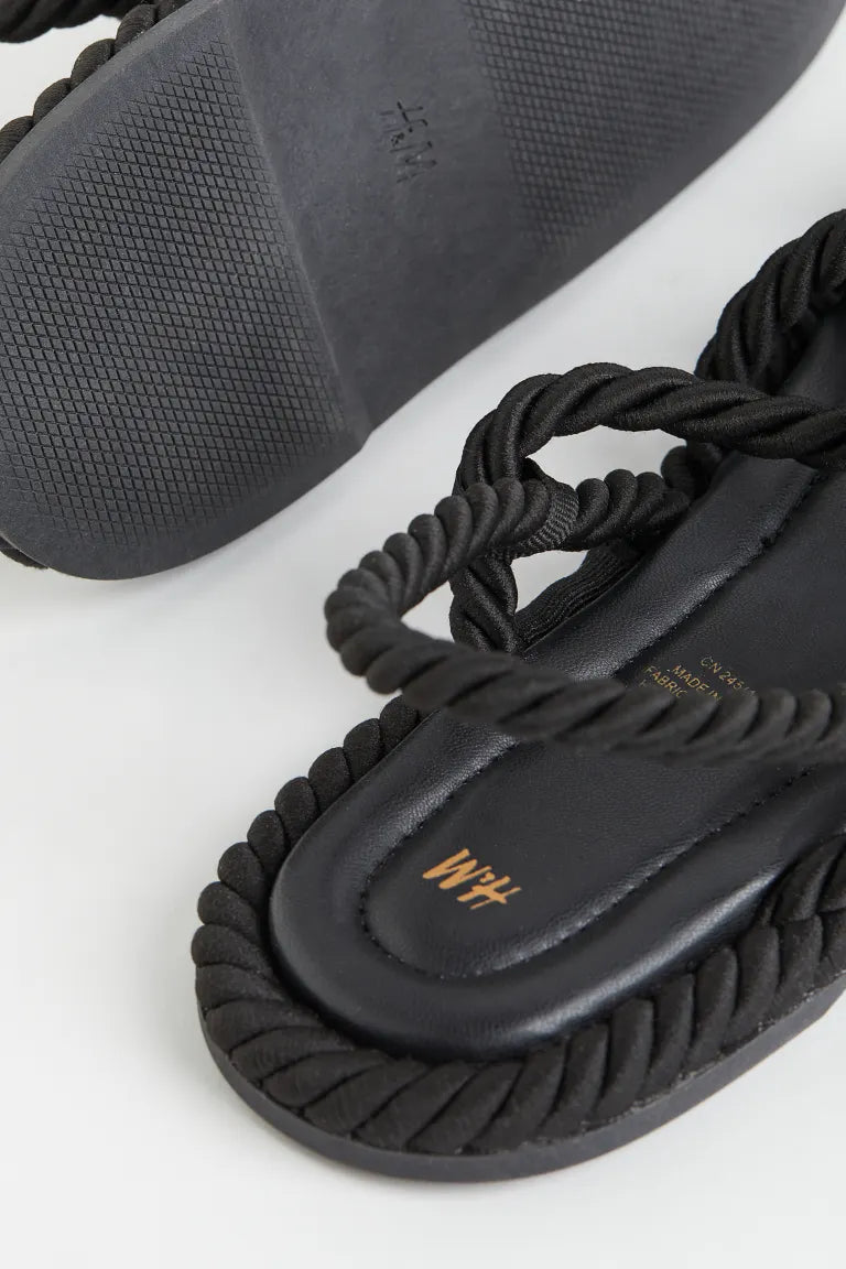Sandals with twisted straps in a rope look. The model has an imitation leather insole and a ribbed outsole. Sole 1.5 cm.