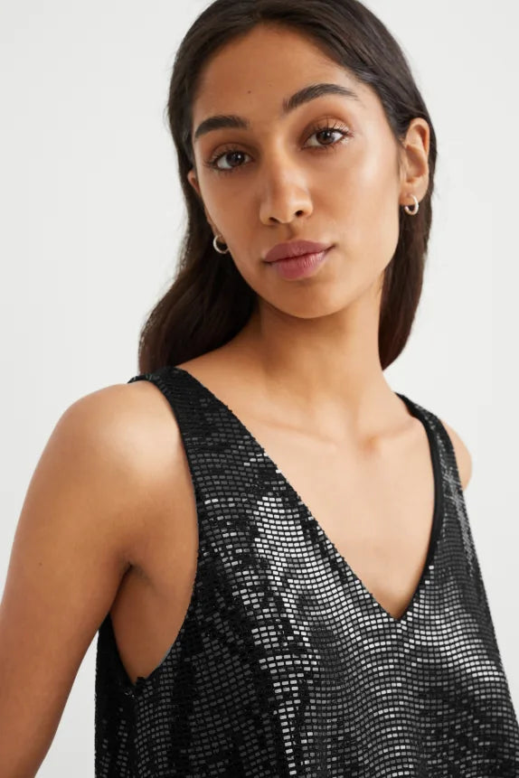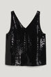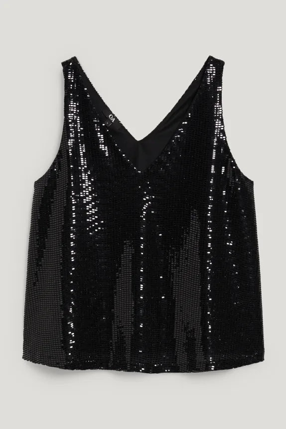 Glanzende top met pailletten, met een afgeronde zoom en voering van jersey.
