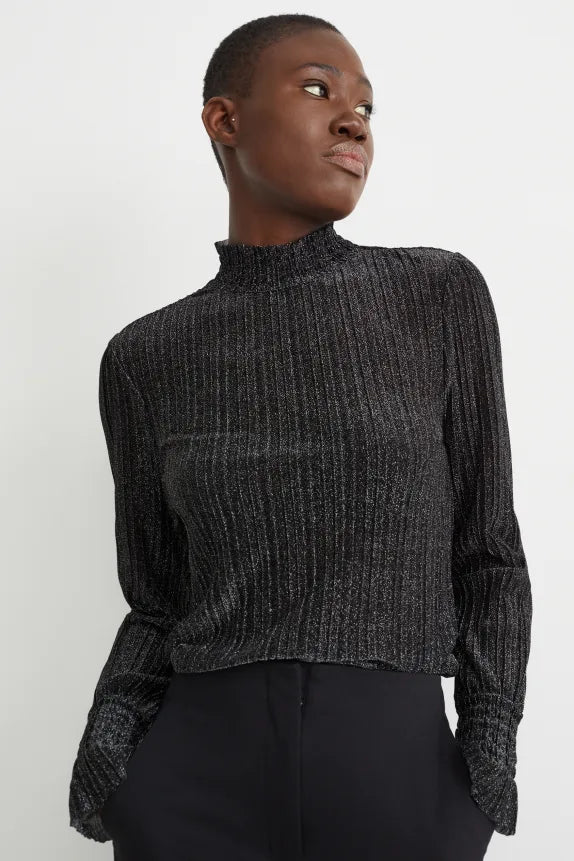 Clemens & August merk dames col shirt trechterhals lange mouwen longsleeve glanzend zwart xs s m l xl