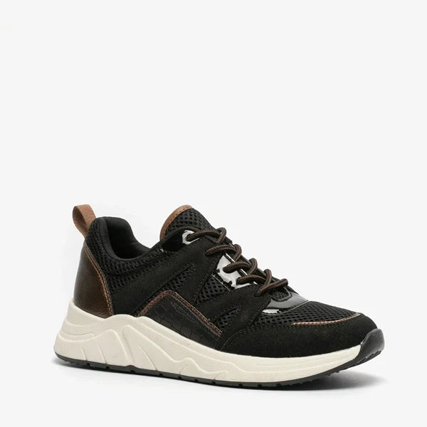 Made of imitation leather and textile, with a textile lining and a sturdy treaded sole. The sneakers have a lace-up closure and a heel pull for easy entry. The comfortable imitation leather footbed is non-removable. The dad sneakers feature bronze accents on the upper and a chunky white sole with black details.