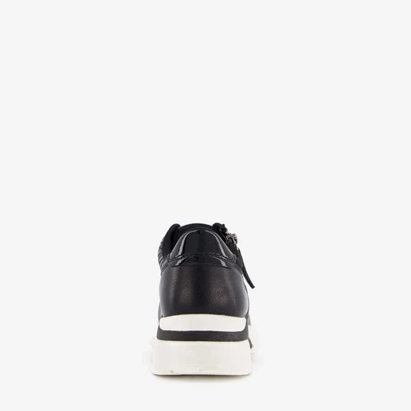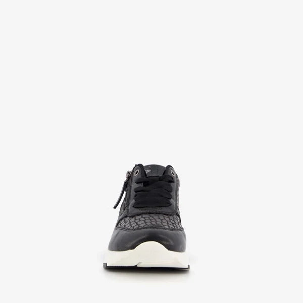 Made of imitation leather, a textile lining, and a sturdy treaded sole. The sneakers have a lace-up closure and a zipper for easy entry. The comfortable textile footbed is non-removable. They feature a crocodile print on the side panels and toe. The dad sneakers have a thick sole with white, contrasting accents.