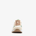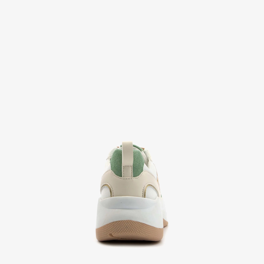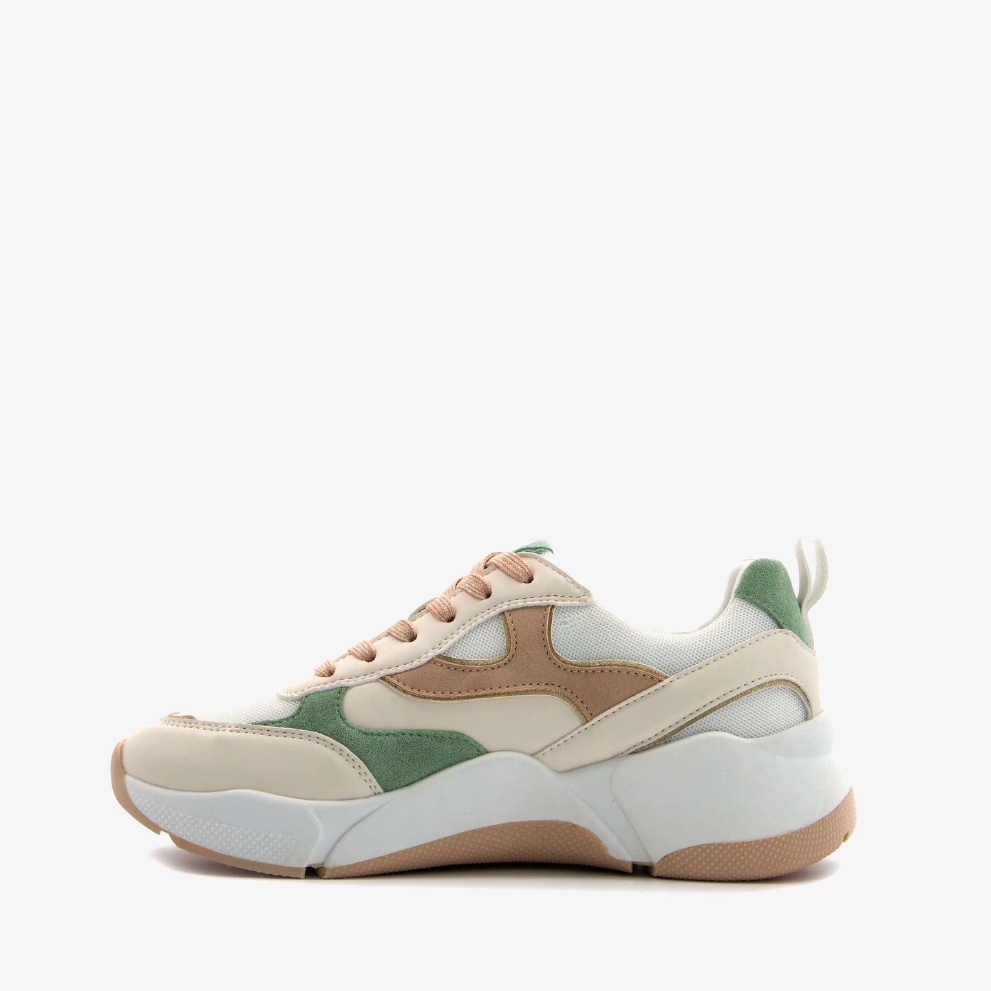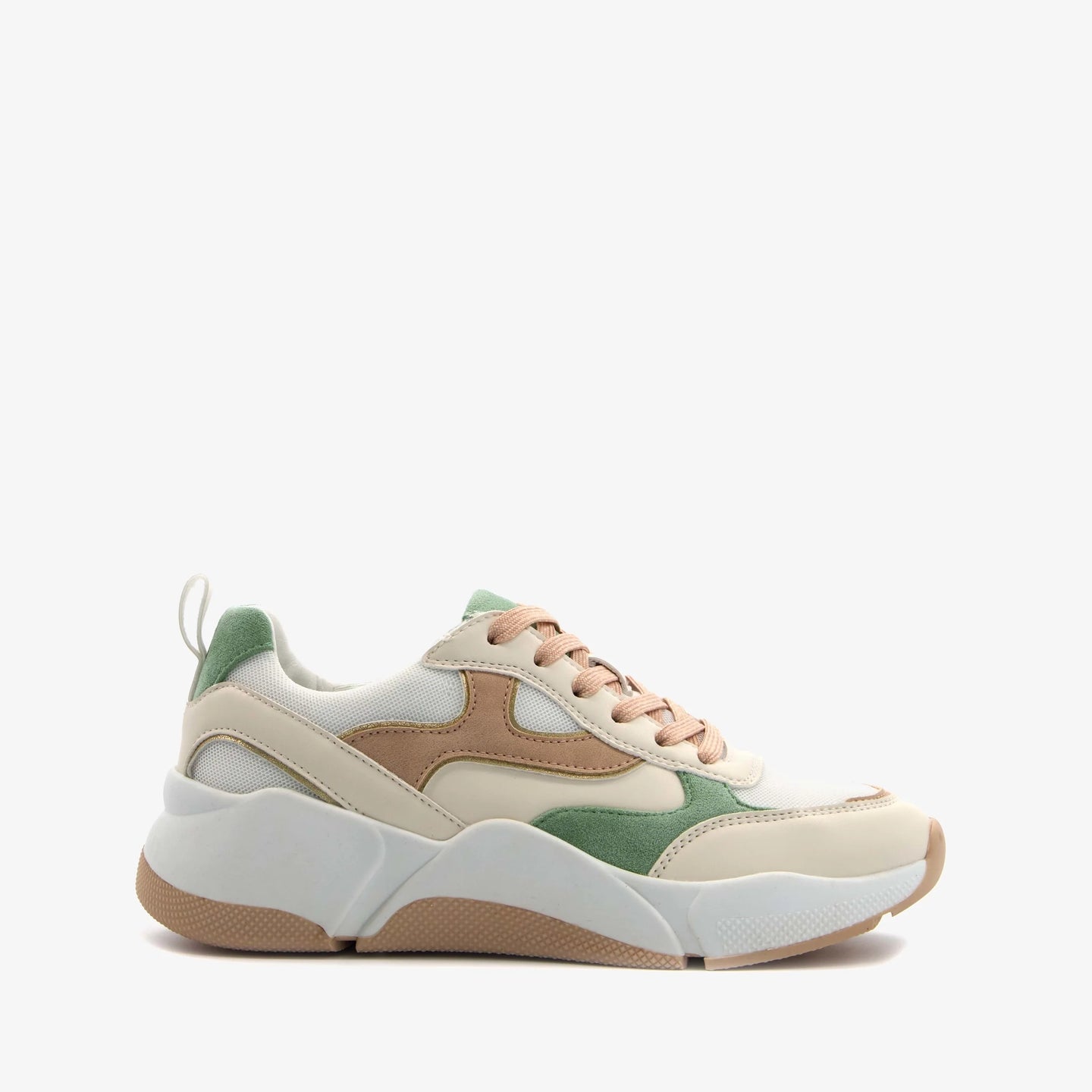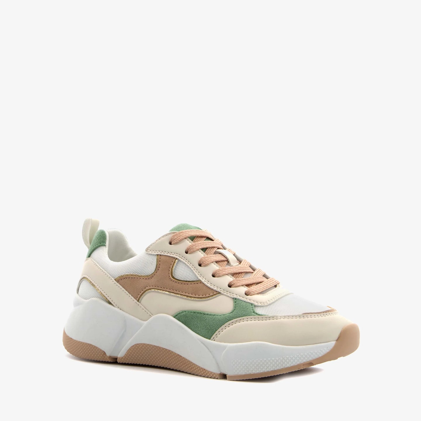 Made of faux leather, a textile lining, and a sturdy treaded sole. These dad sneakers feature peach-colored laces and a removable textile footbed with memory foam for extra comfort. They also have a pull tab on the heel and pastel green and brown accents on the upper. The white chunky sole provides grip and cushioning.
