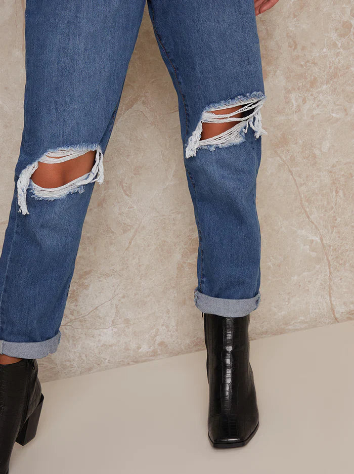 These mom jeans are perfect for adding an edge to any outfit. Featuring blue was denim with distressed knees, the relaxed fit make them perfect for everyday style.