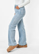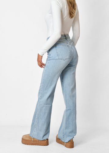 De broek loopt recht uit, heeft een destroyed detail en heeft een gerafelde onderkant. Verder heeft de broek twee zakken voor en achterop en sluit middels een rits met knoop.