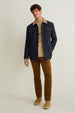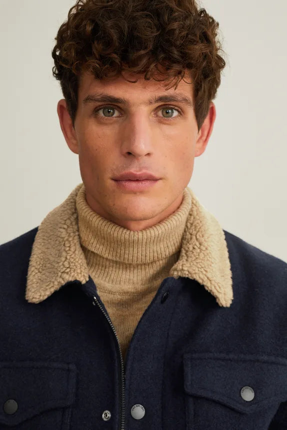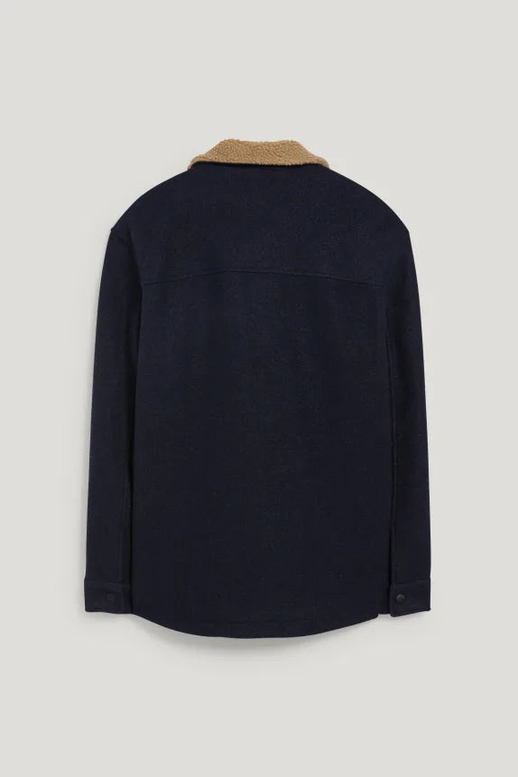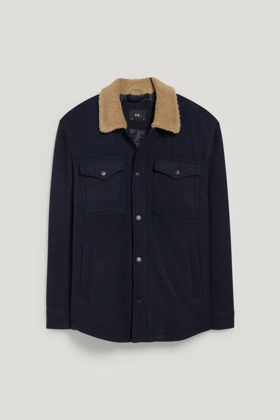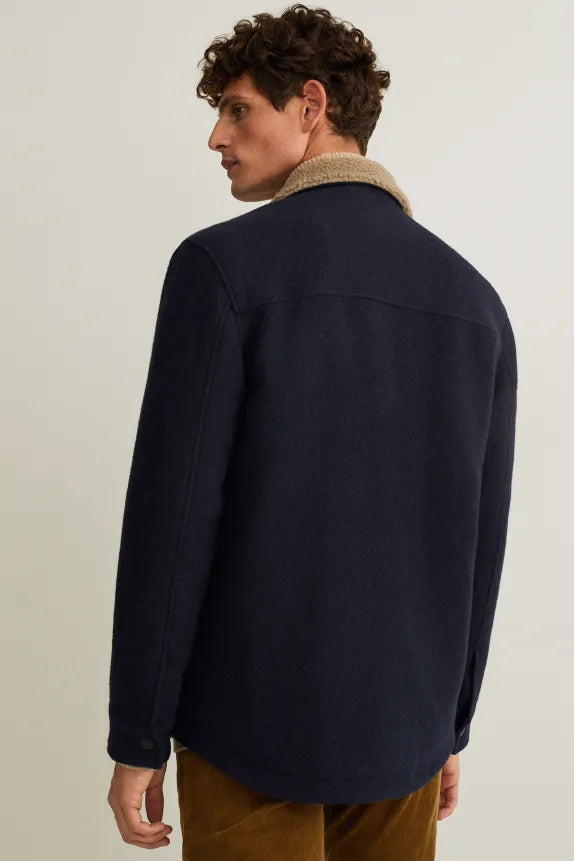 Jacket made of robust, partially wool fabric, with a teddy fur collar. Two buttoned flap pockets and two slit pockets. Stitched lining, one snap pocket, and one zip pocket.