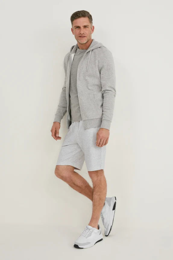 Sweat shorts made of soft fabric with two side pockets and a patch pocket at the back.