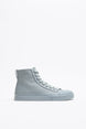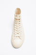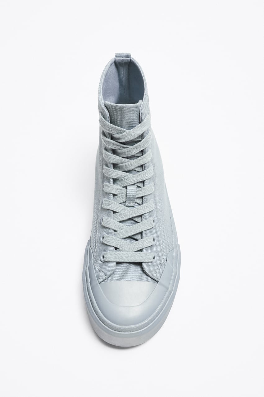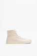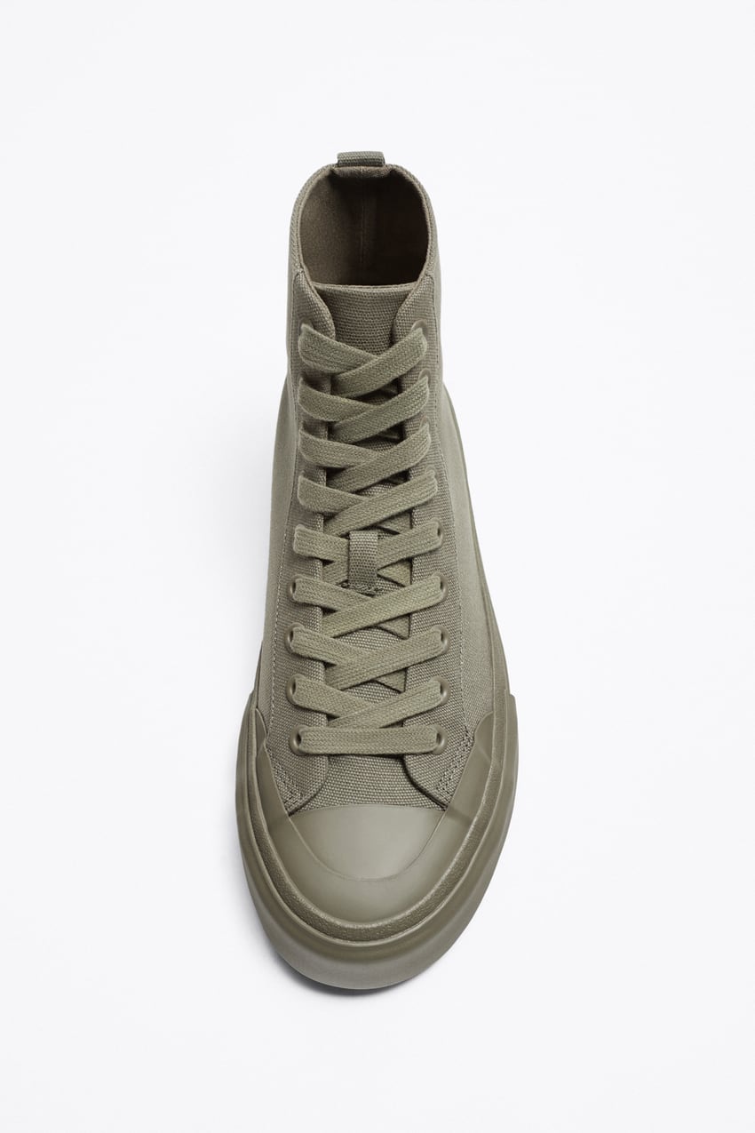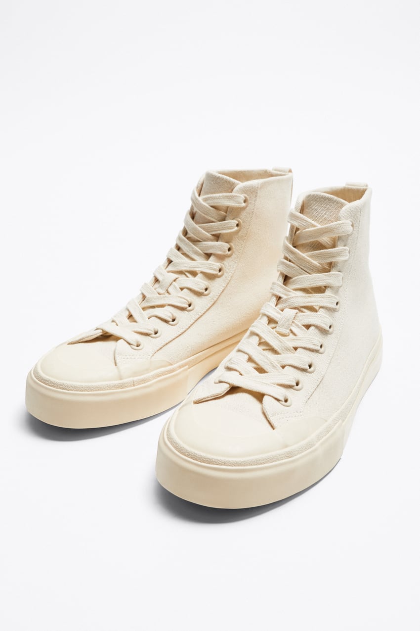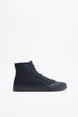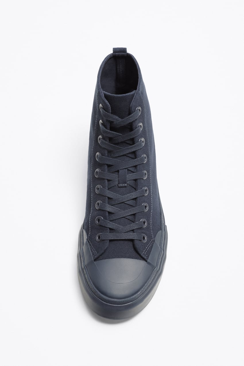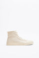 High-top sneakers. Plain canvas upper. Nine-eyelet upper. Slightly voluminous sole. Retro design.