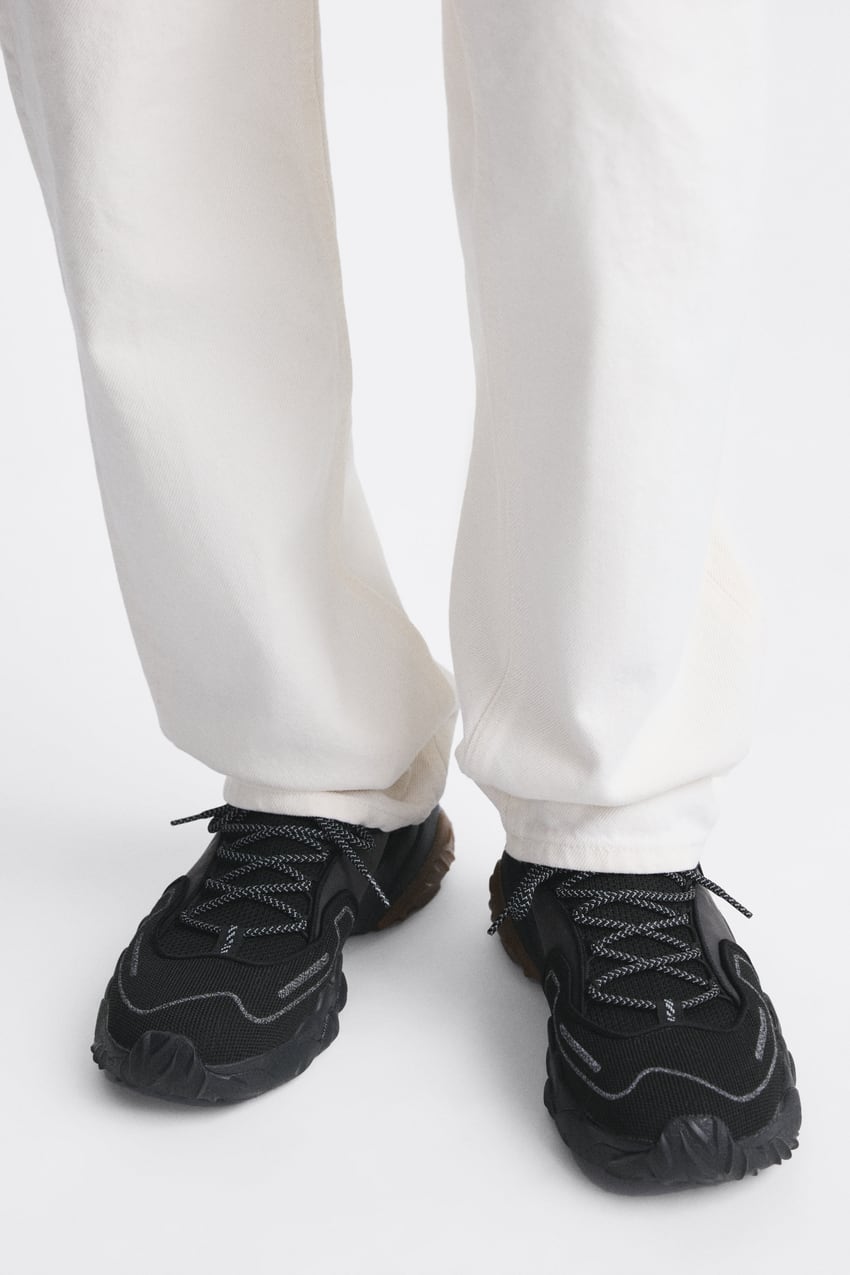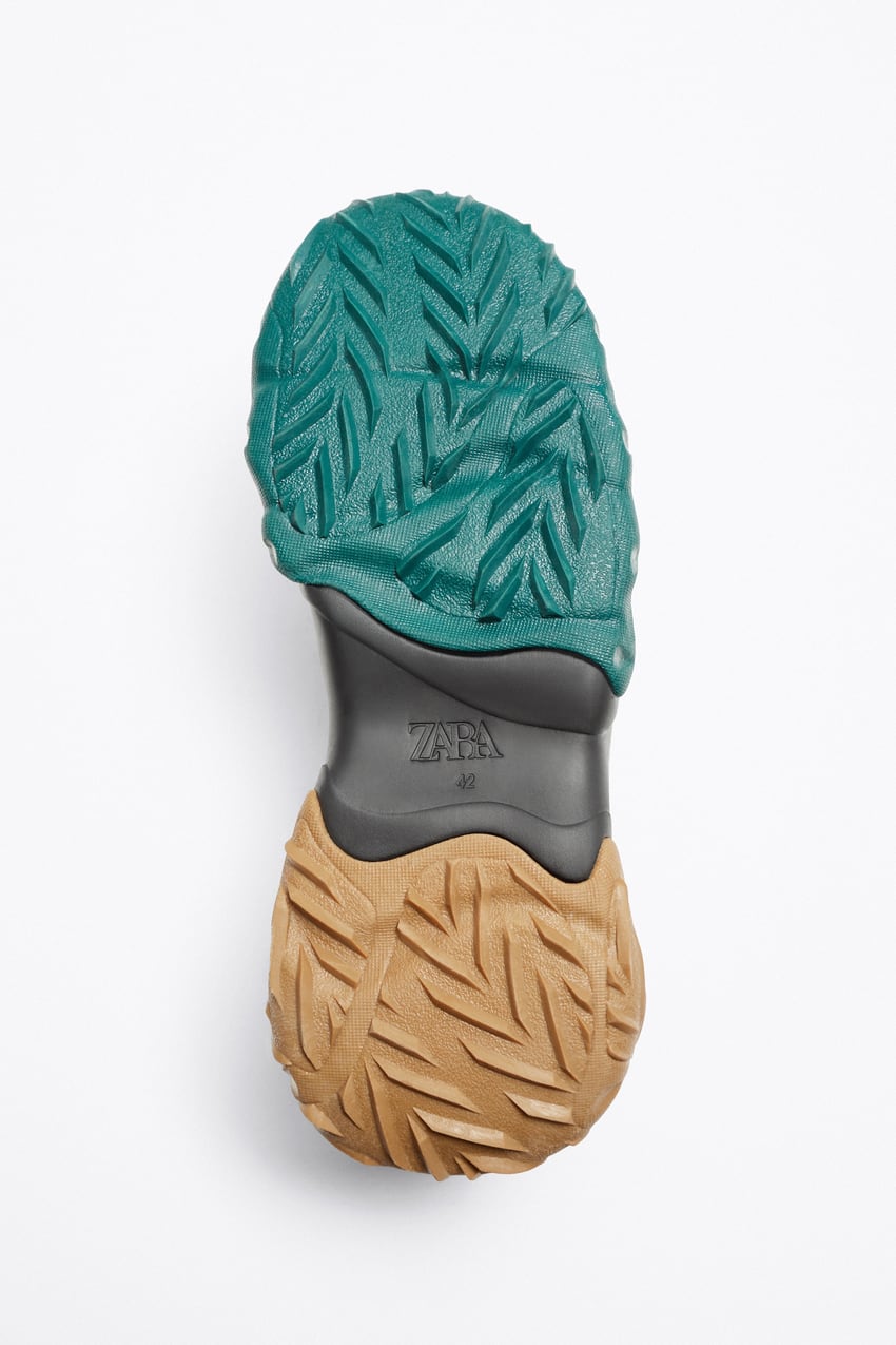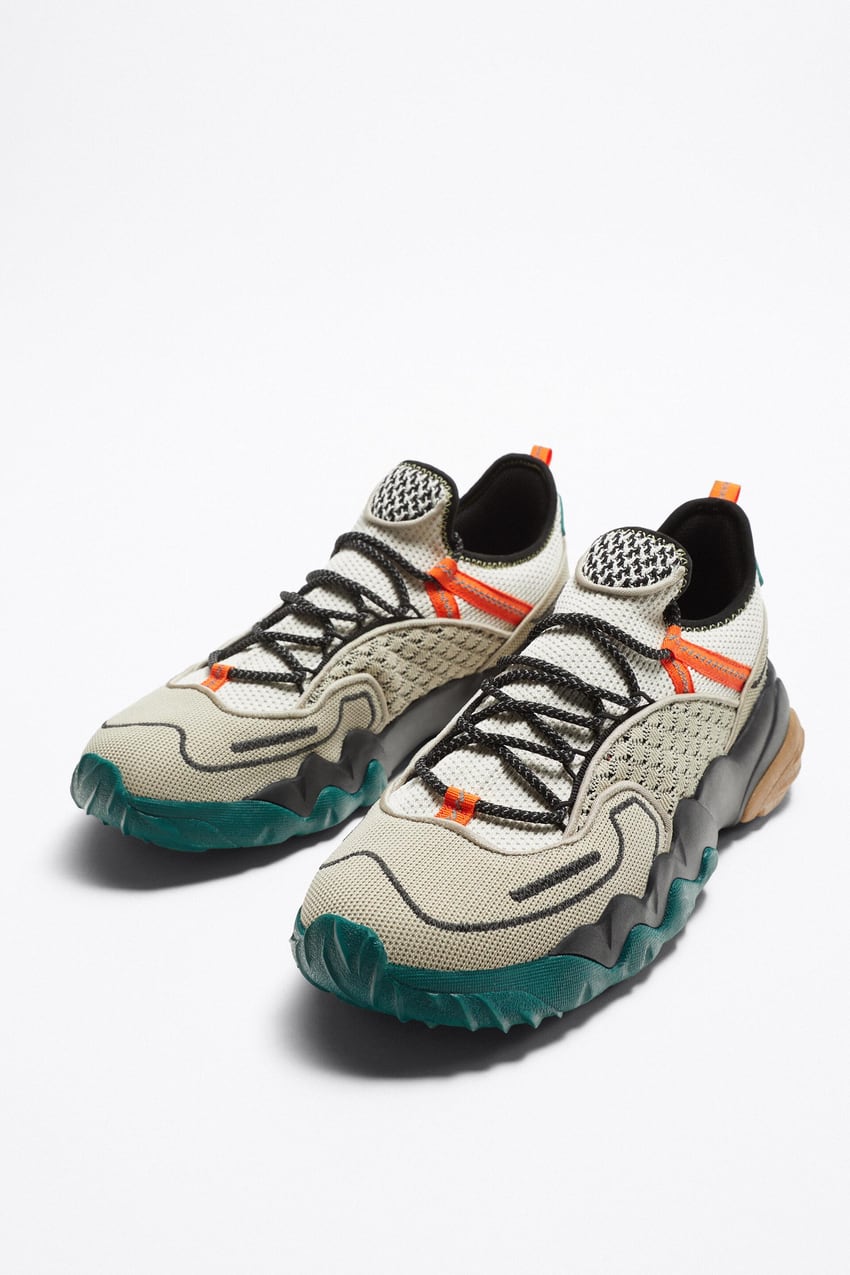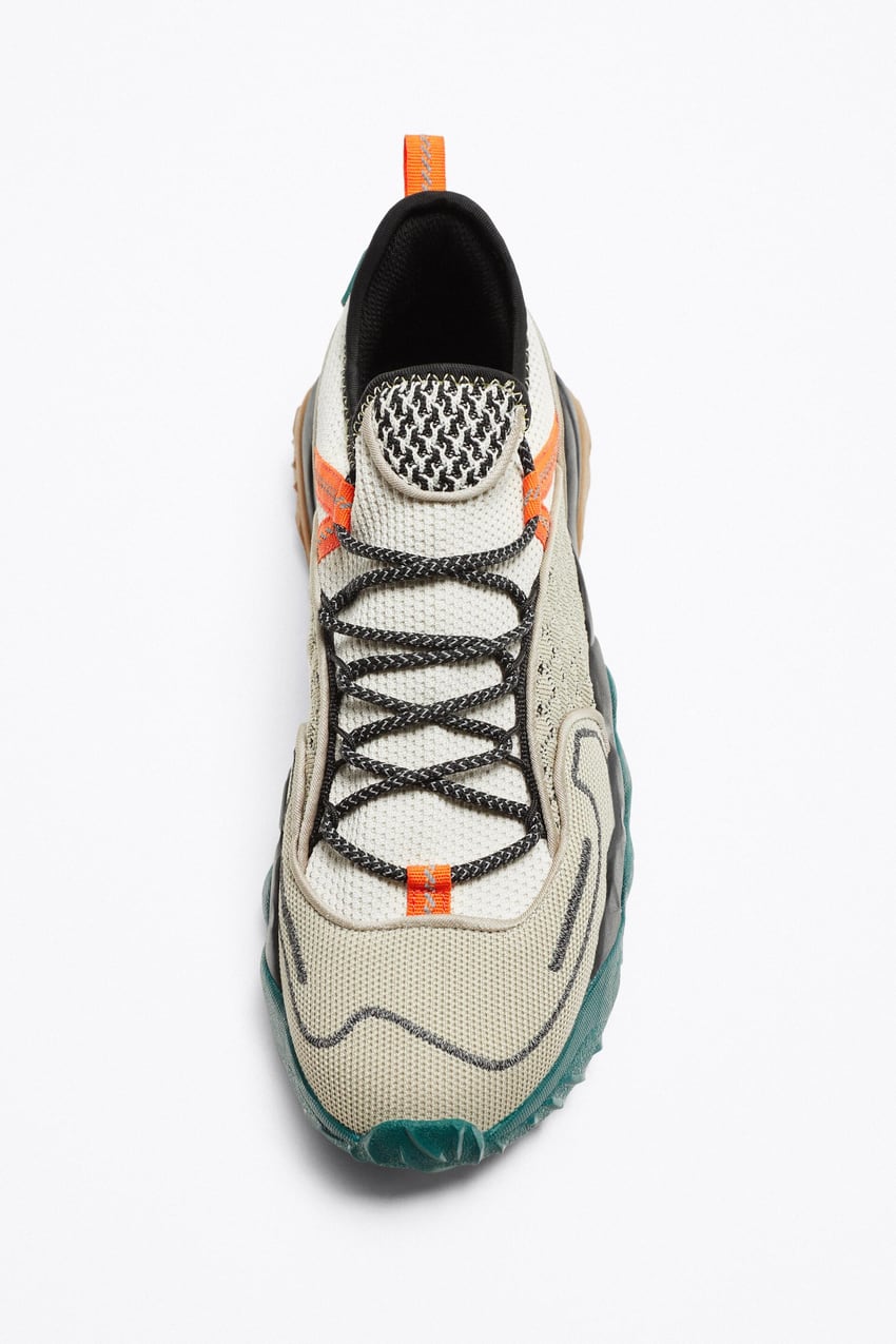 Laceless running sneakers. Made of knitted fabric. Upper with various pieces in different colors. Chunky, multi-piece sole with an irregular design.