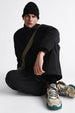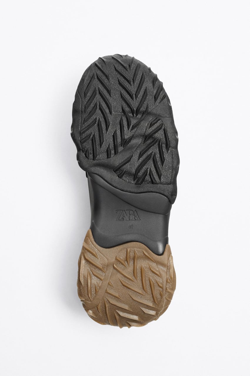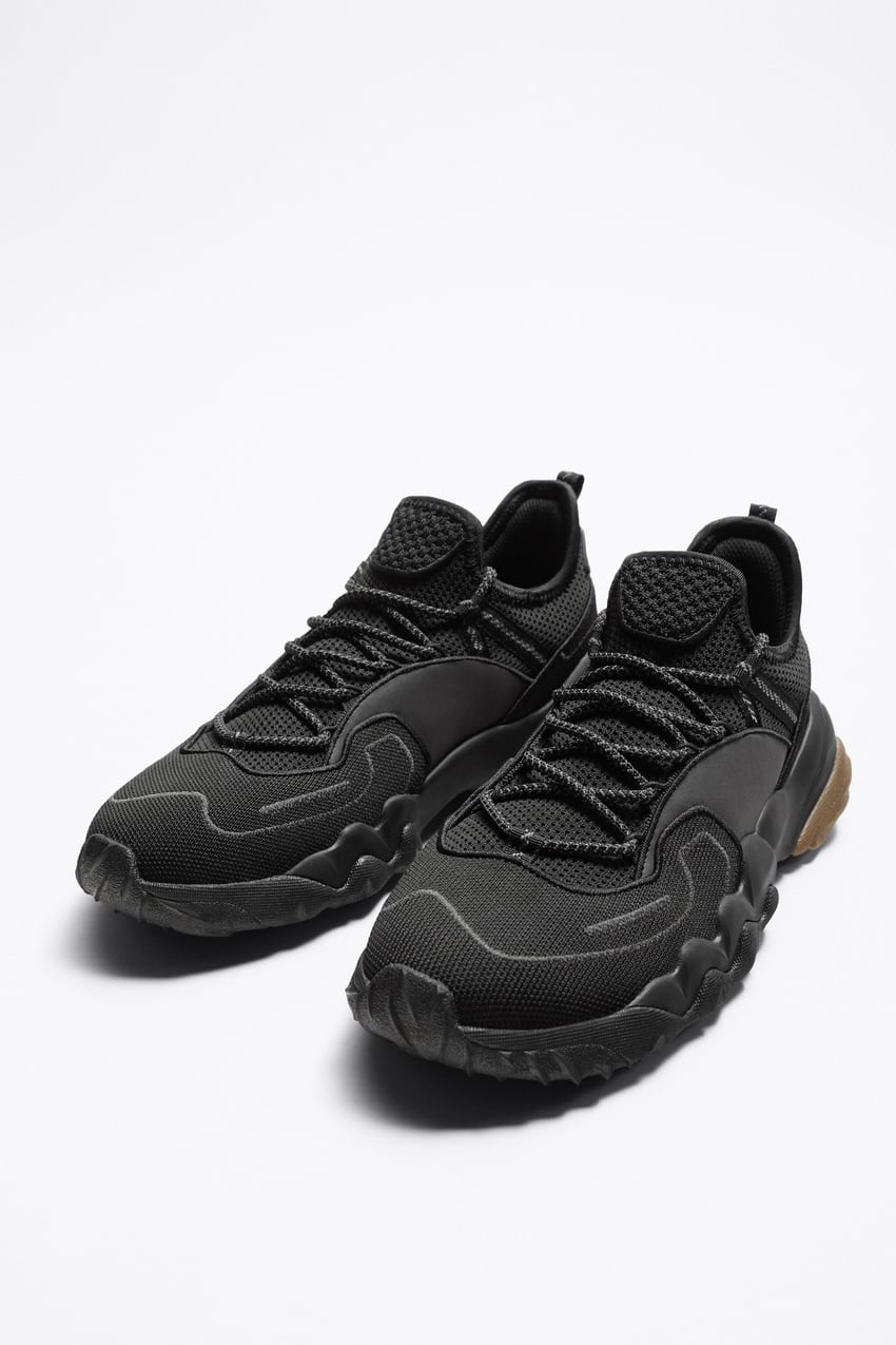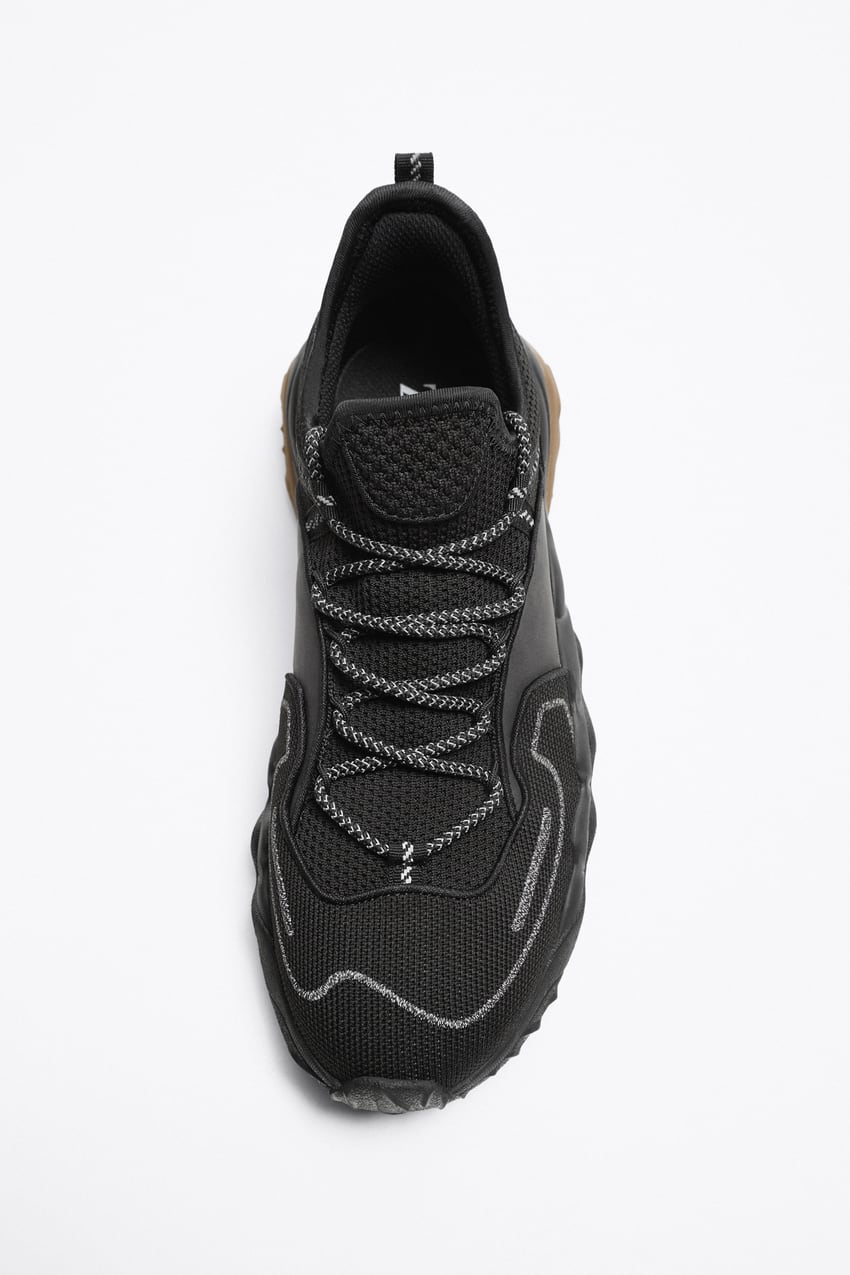 Laceless running sneakers. Made of knitted fabric. Upper with various pieces in different colors. Chunky, multi-piece sole with an irregular design.