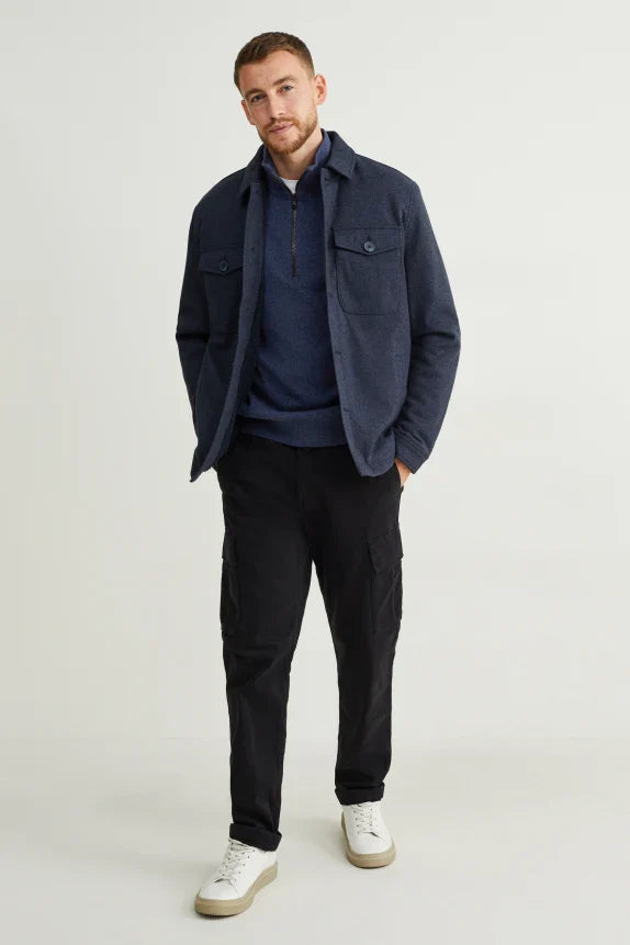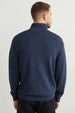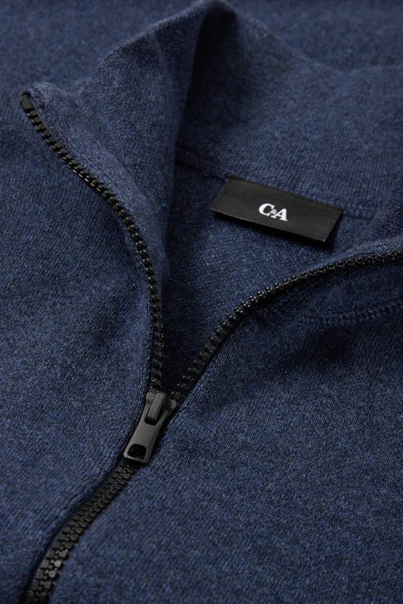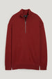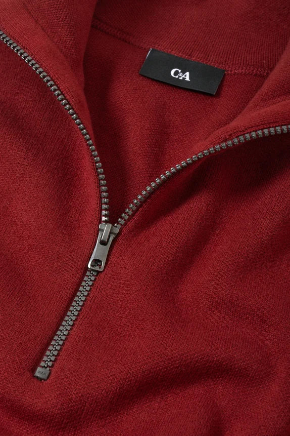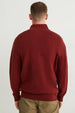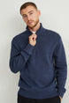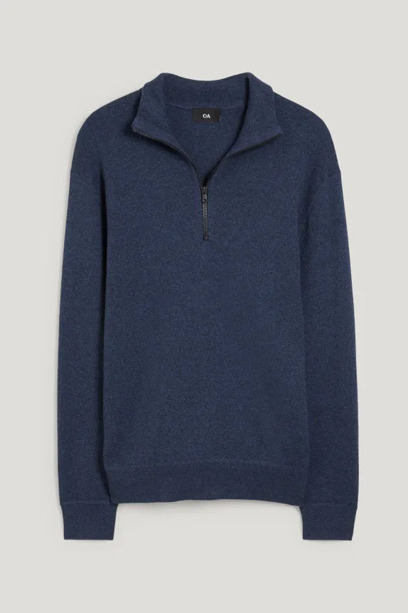 Soft, knitted Troyer-style sweater with cuffs at the ends.