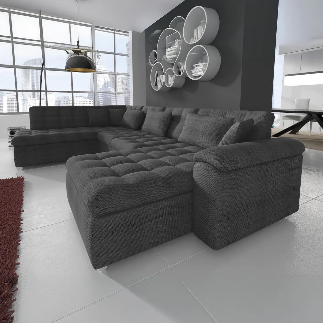 With the Nicoreta corner sofa, you'll bring a spacious and modern seating area into your home. The soft gray fabric feels pleasant to the touch and creates a warm atmosphere in your living room, while the fixed cushions with quilted seats create a sleek and stylish look. The spacious U-shaped configuration seats 5 to 6 people.