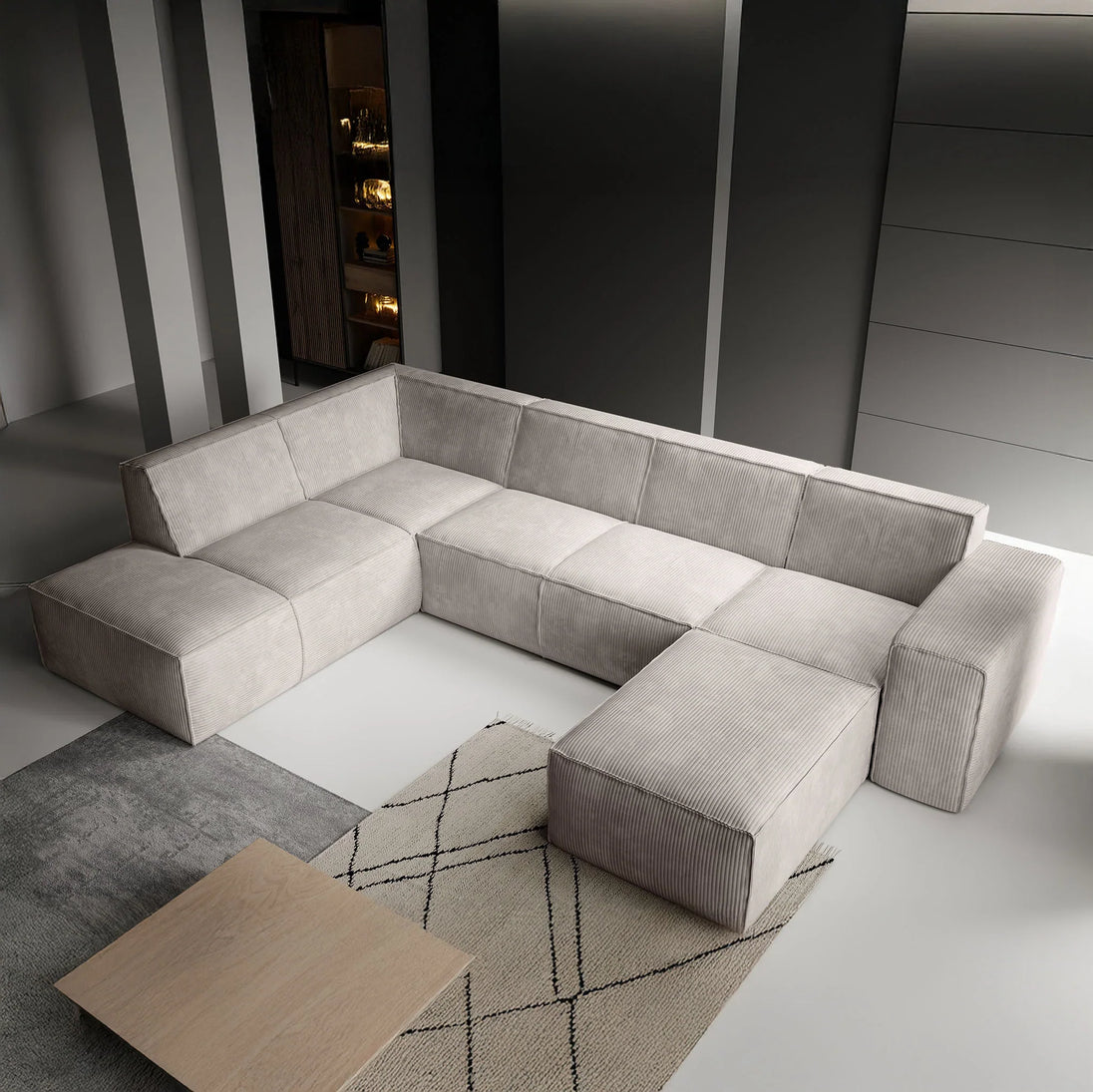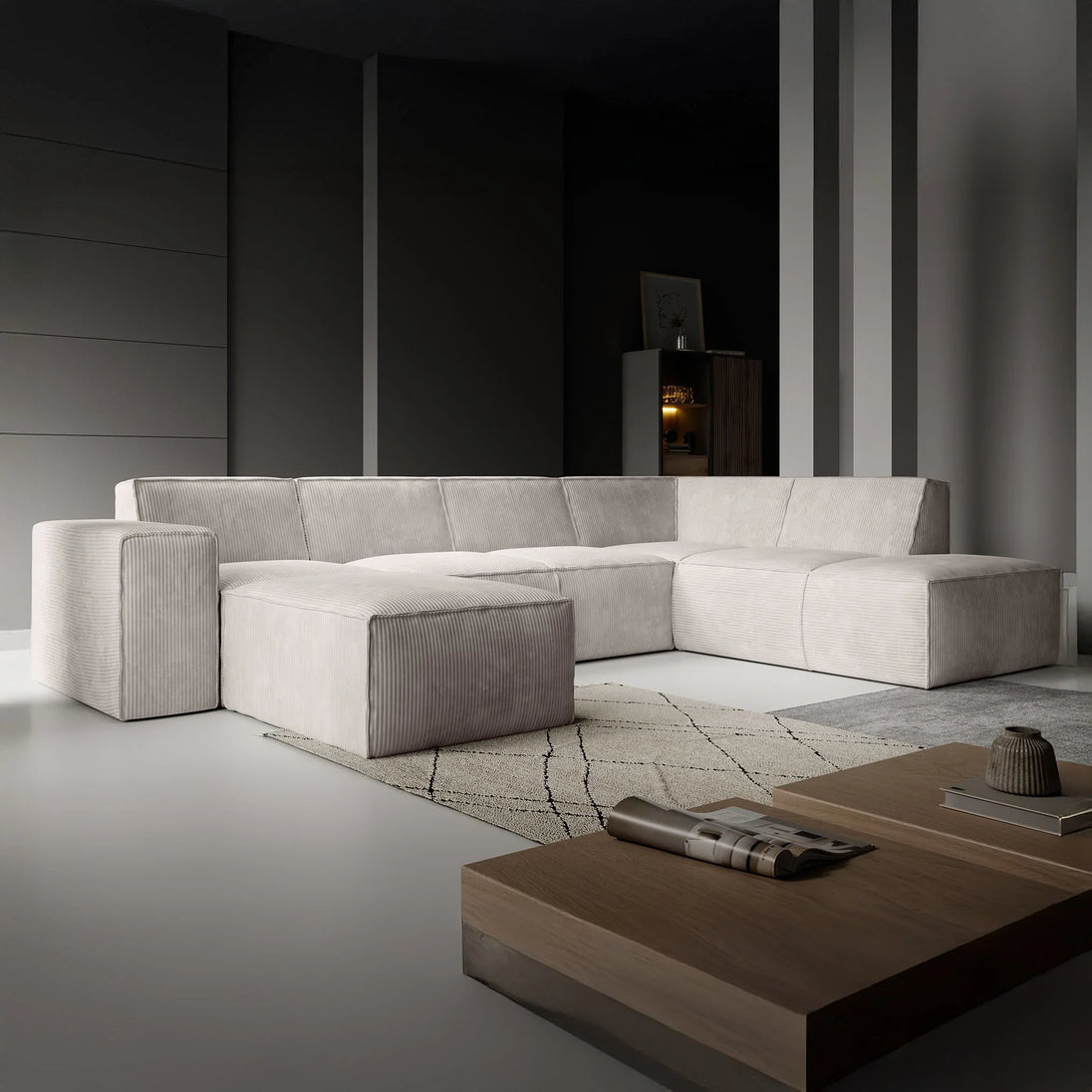 This corner sofa is a spacious lounge sofa with seating for 6 to 7 people. It's upholstered in a soft beige ribbed fabric and has a modern, inviting look.