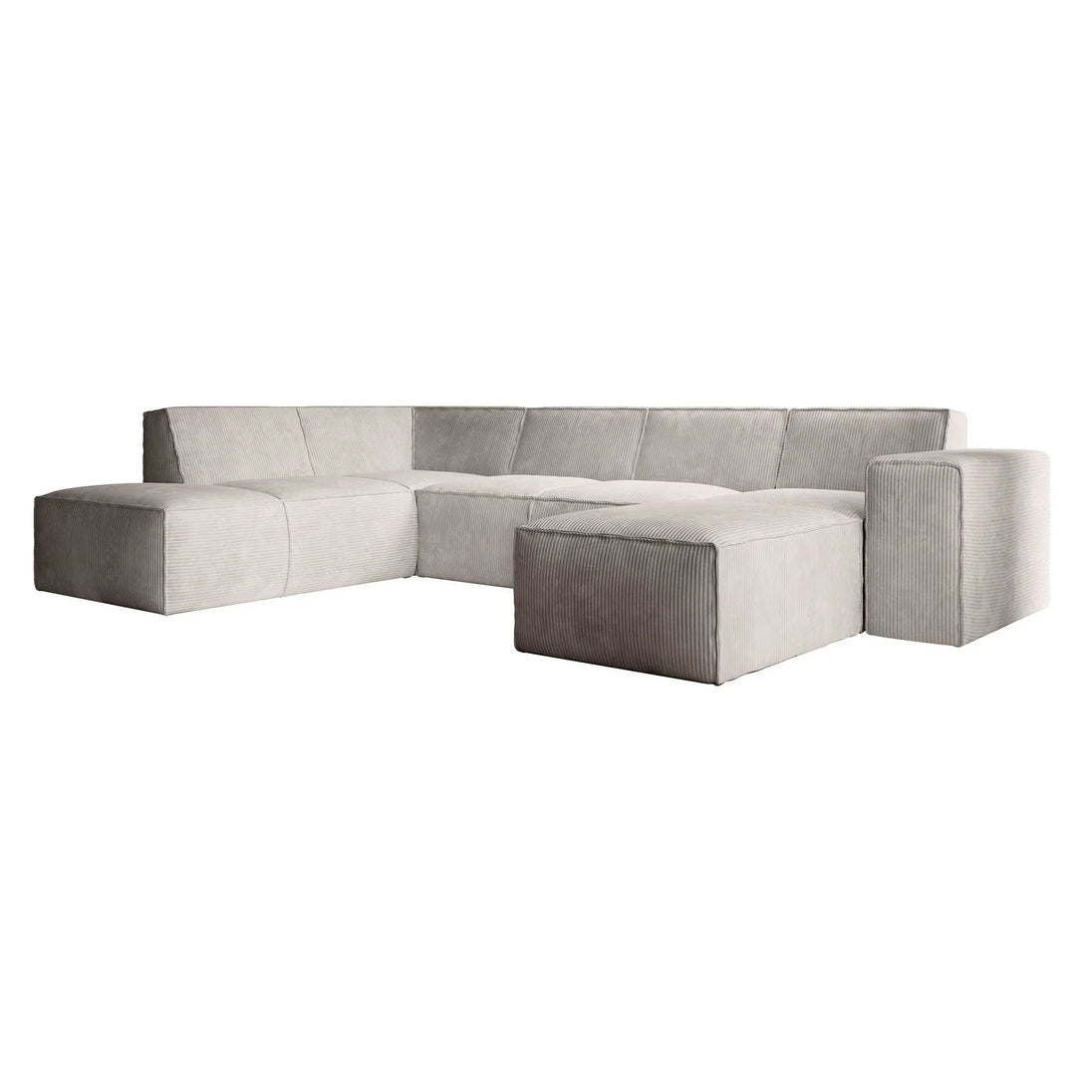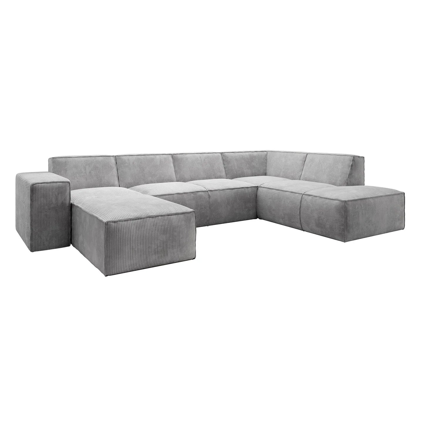 The model features a spacious chaise longue on the left (viewed from the front), a wide two-seater, a corner sectional, and a two-and-a-half-seater on the right. The seat and back cushions are securely stitched and finished with a distinctive, coarse seam along the edges. The sofa stands on low, round legs.