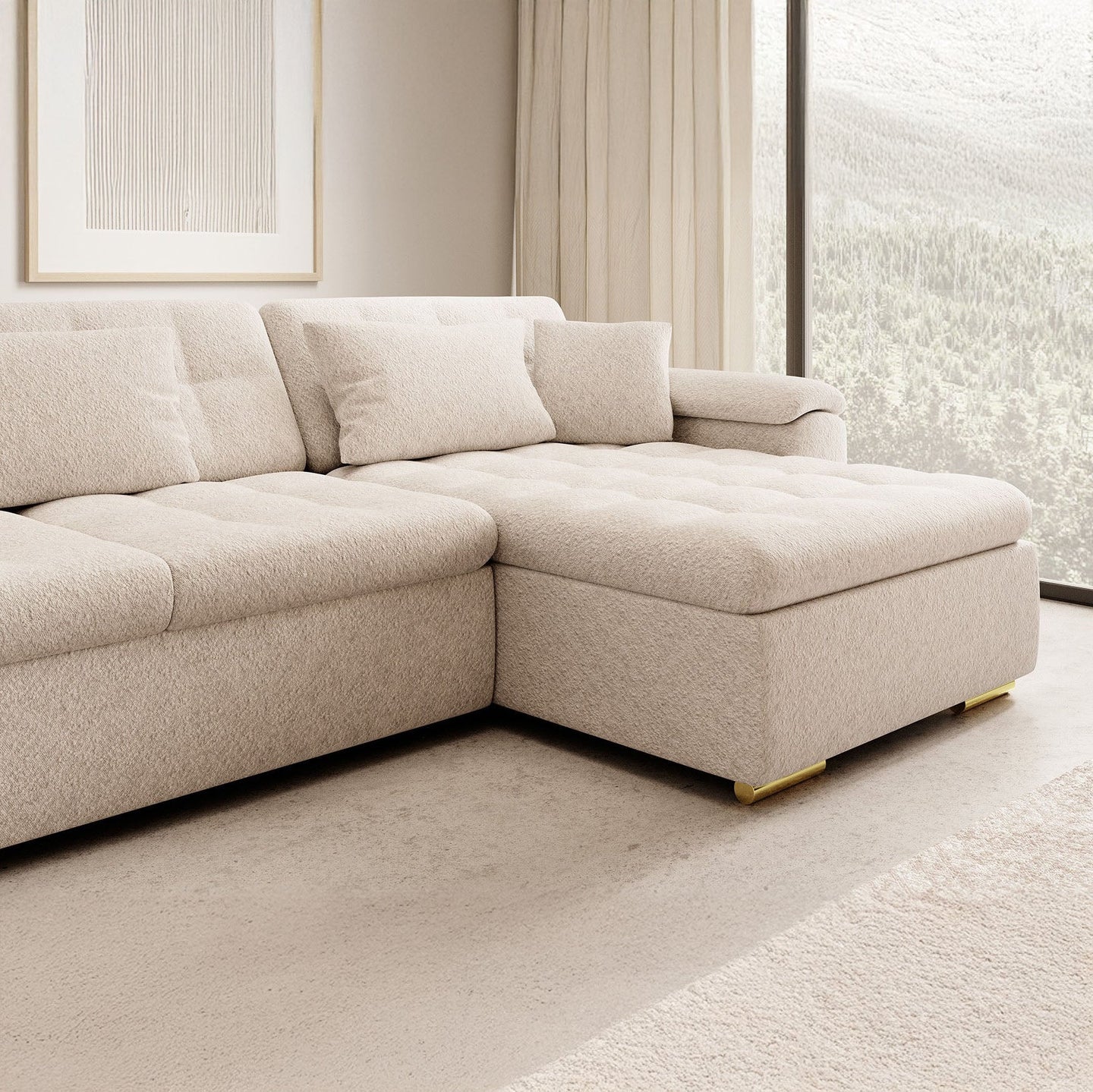 The Nicoreta corner sofa brings generous and modern seating into your home. The teddy bouclé upholstery feels wonderfully soft and gives the sofa a warm, cuddly look that fits perfectly into a light, calm interior style. The spacious U-shaped arrangement seats 5 to 6 people.