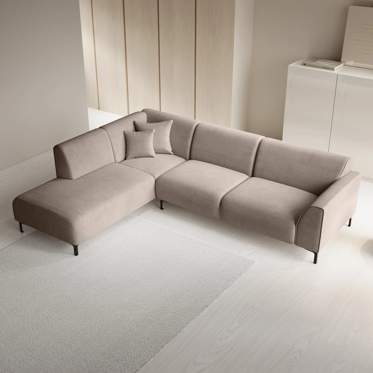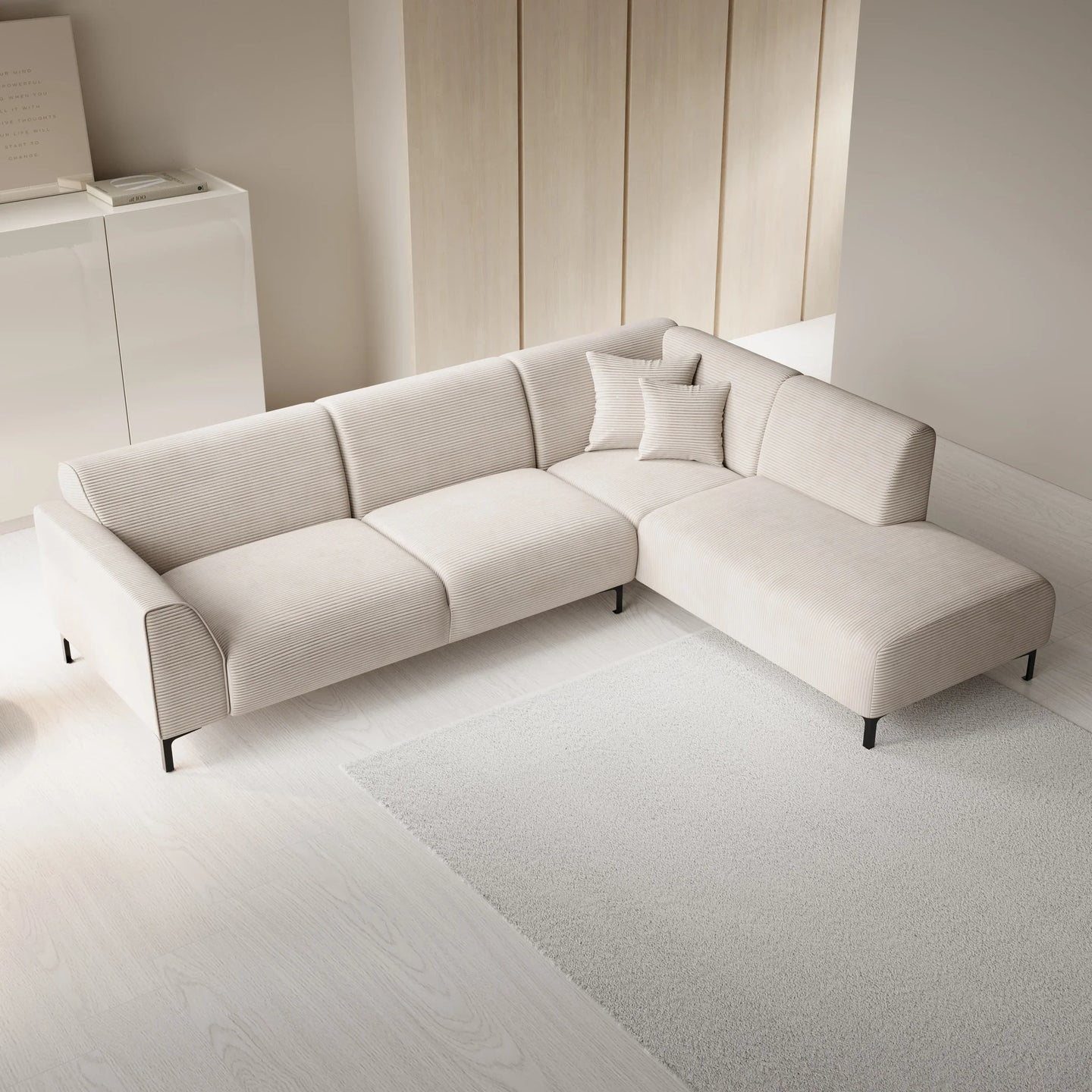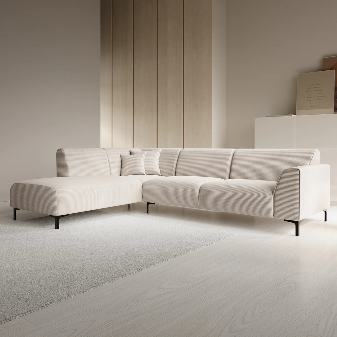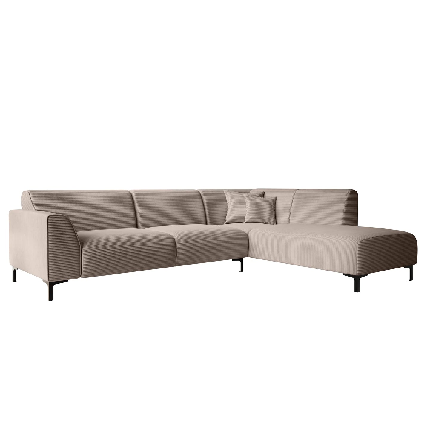 The Moana corner sofa is a modern sofa made of beige ribbed fabric. This model seats 4 to 5 people. In addition to the two-seater, it also features a lounge section. The corner sofa stands on high, black metal legs. The Moana includes both fixed back cushions and seat cushions and comes with two matching decorative cushions.
