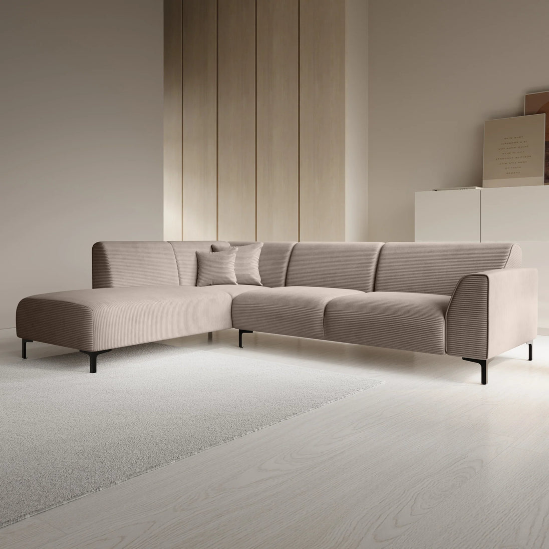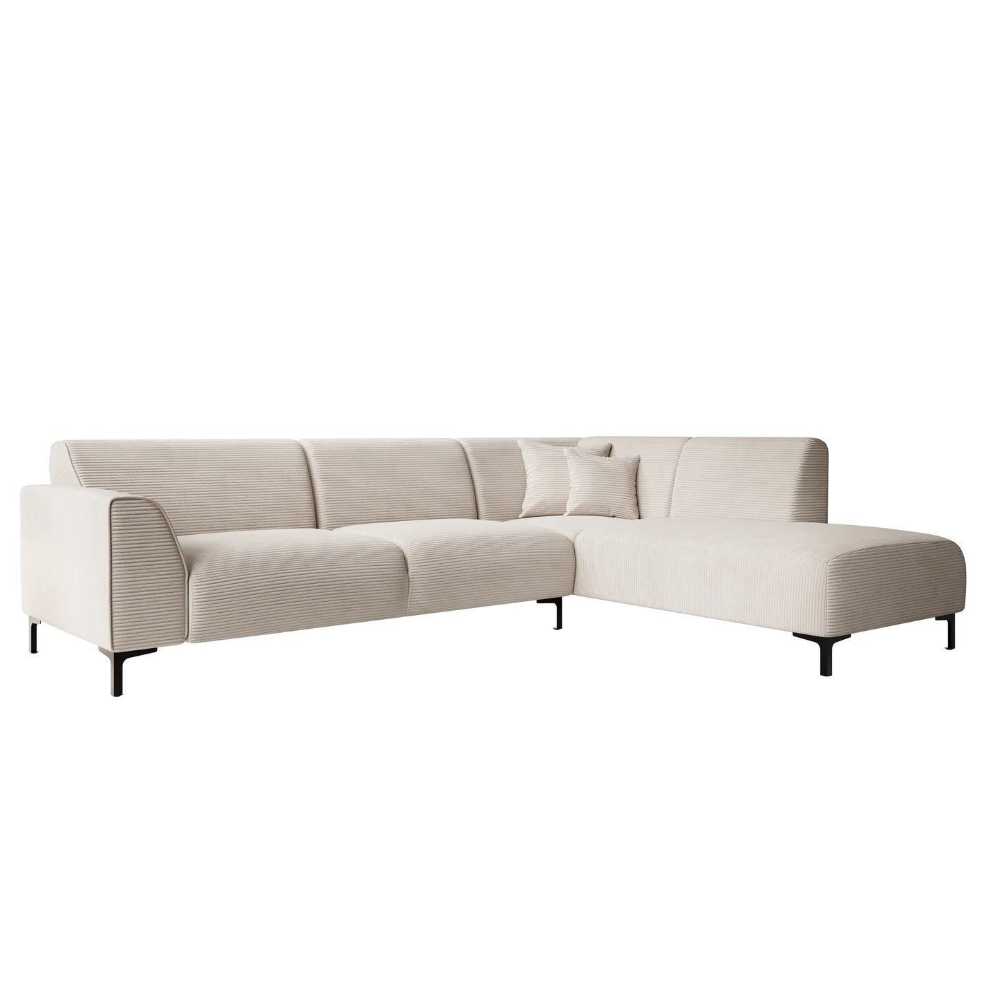 The Moana corner sofa is a modern sofa made of beige ribbed fabric. This model seats 4 to 5 people. In addition to the two-seater, it also features a lounge section. The corner sofa stands on high, black metal legs. The Moana includes both fixed back cushions and seat cushions and comes with two matching decorative cushions.