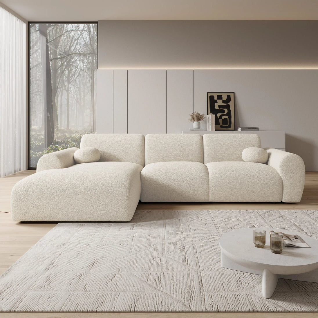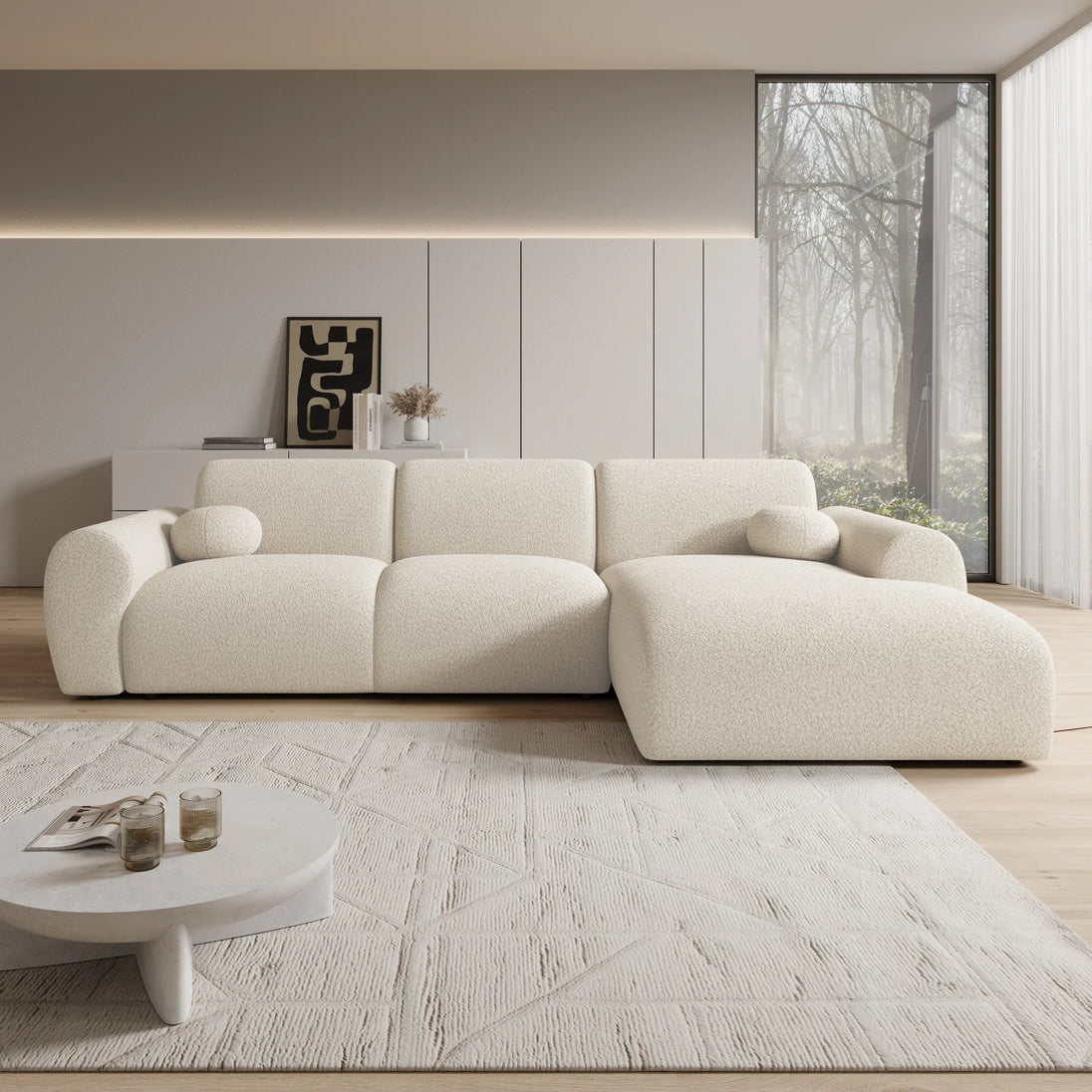 The Canyon corner sofa is a modern, cozy sofa made of beige teddy fabric. This model seats four people. In addition to the two-seater, the sofa also features a lounge section. The corner sofa is upholstered in soft beige teddy fabric. The Canyon includes both fixed back cushions and seat cushions and comes with two matching decorative cushions.