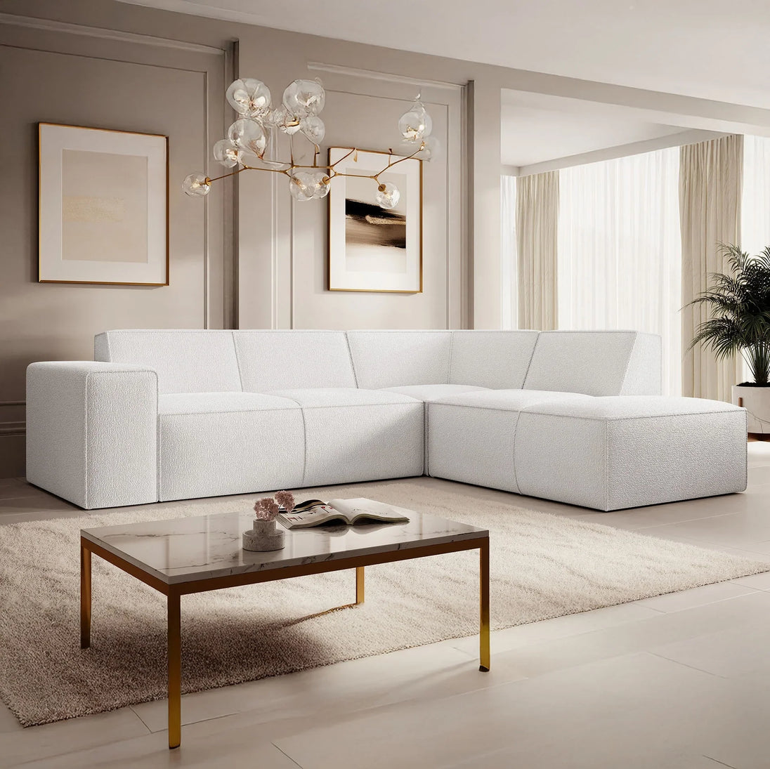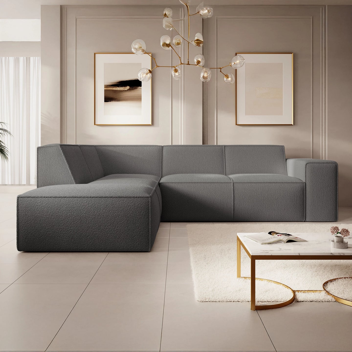 The corner sofa is upholstered in soft teddy fabric in a shade of gray – a trendy and timeless choice that instantly adds ambiance to your living room. The luxurious bouclé structure feels soft and provides extra comfort, while the fixed back and seat cushions create a sleek, uncluttered look.