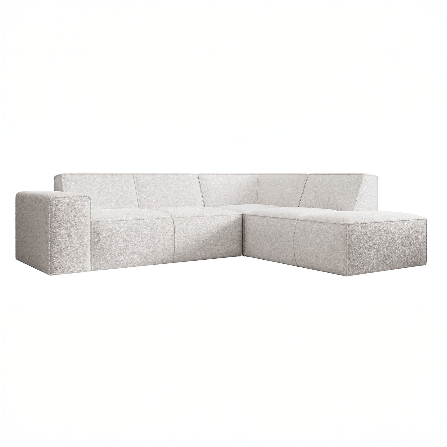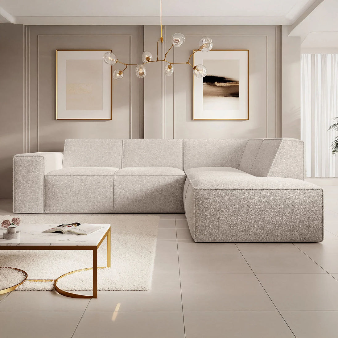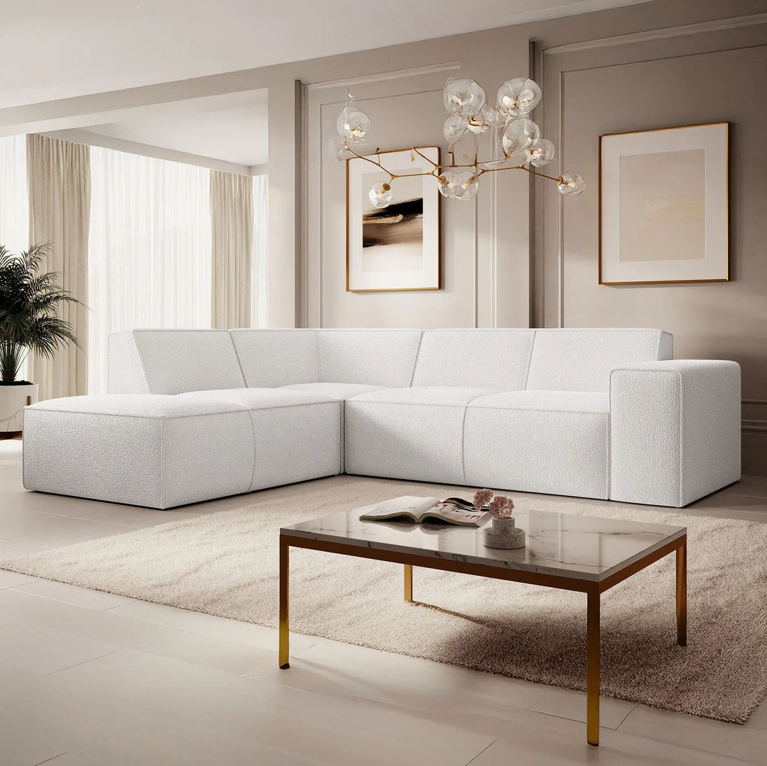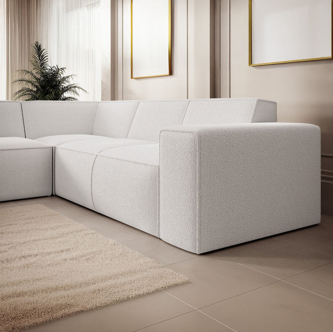 The corner sofa is upholstered in soft teddy fabric in a light white shade – a trendy and timeless choice that instantly adds ambiance to your living room. The luxurious bouclé structure feels soft and provides extra comfort, while the fixed back and seat cushions create a sleek, uncluttered look.