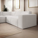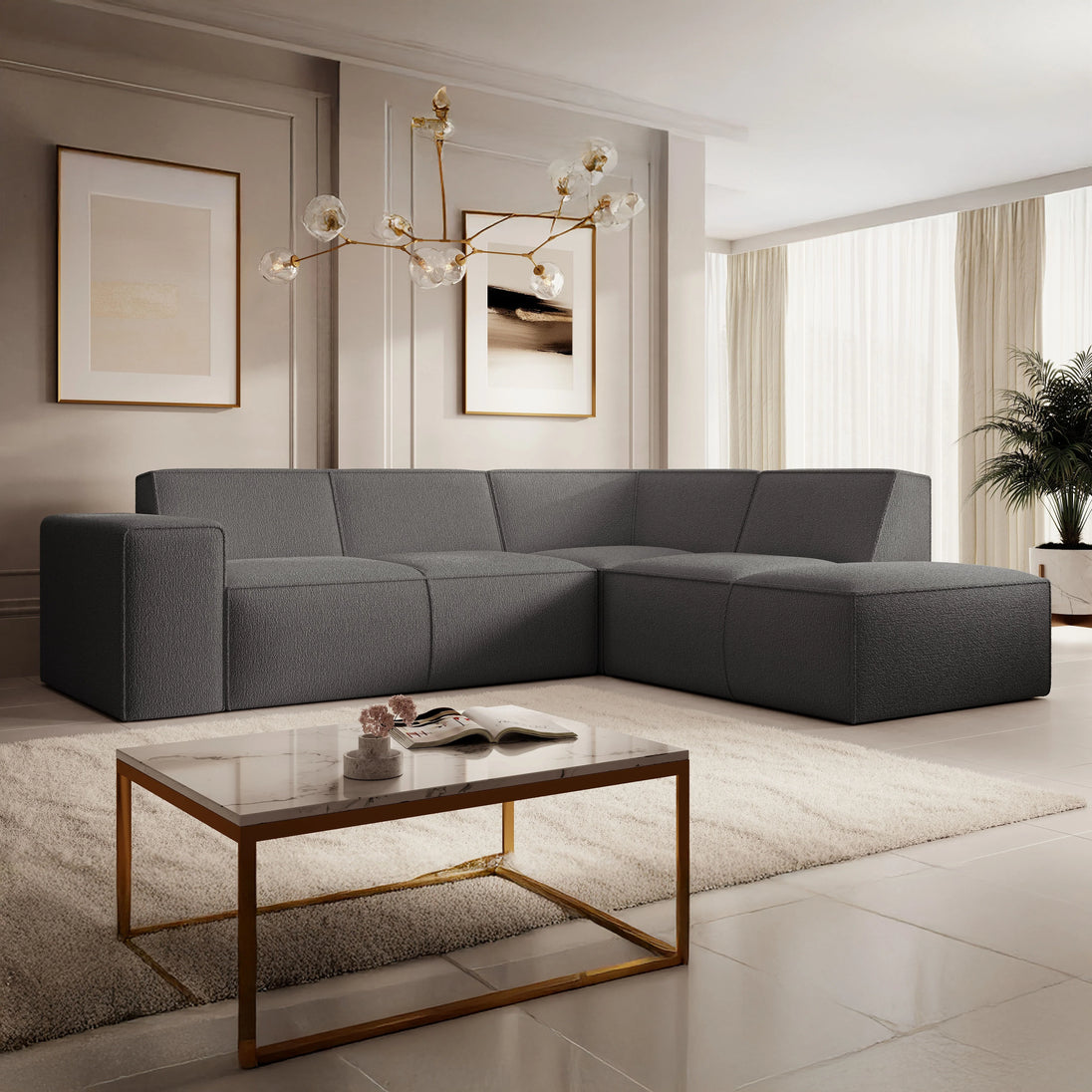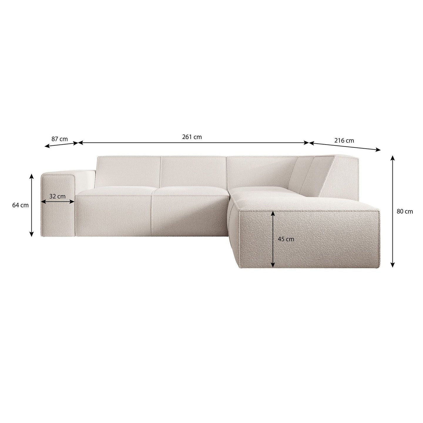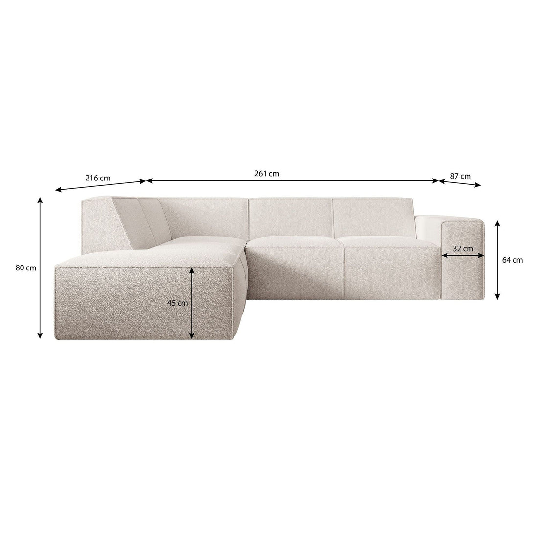 The corner sofa is upholstered in soft teddy fabric in a light white shade – a trendy and timeless choice that instantly adds ambiance to your living room. The luxurious bouclé structure feels soft and provides extra comfort, while the fixed back and seat cushions create a sleek, uncluttered look.